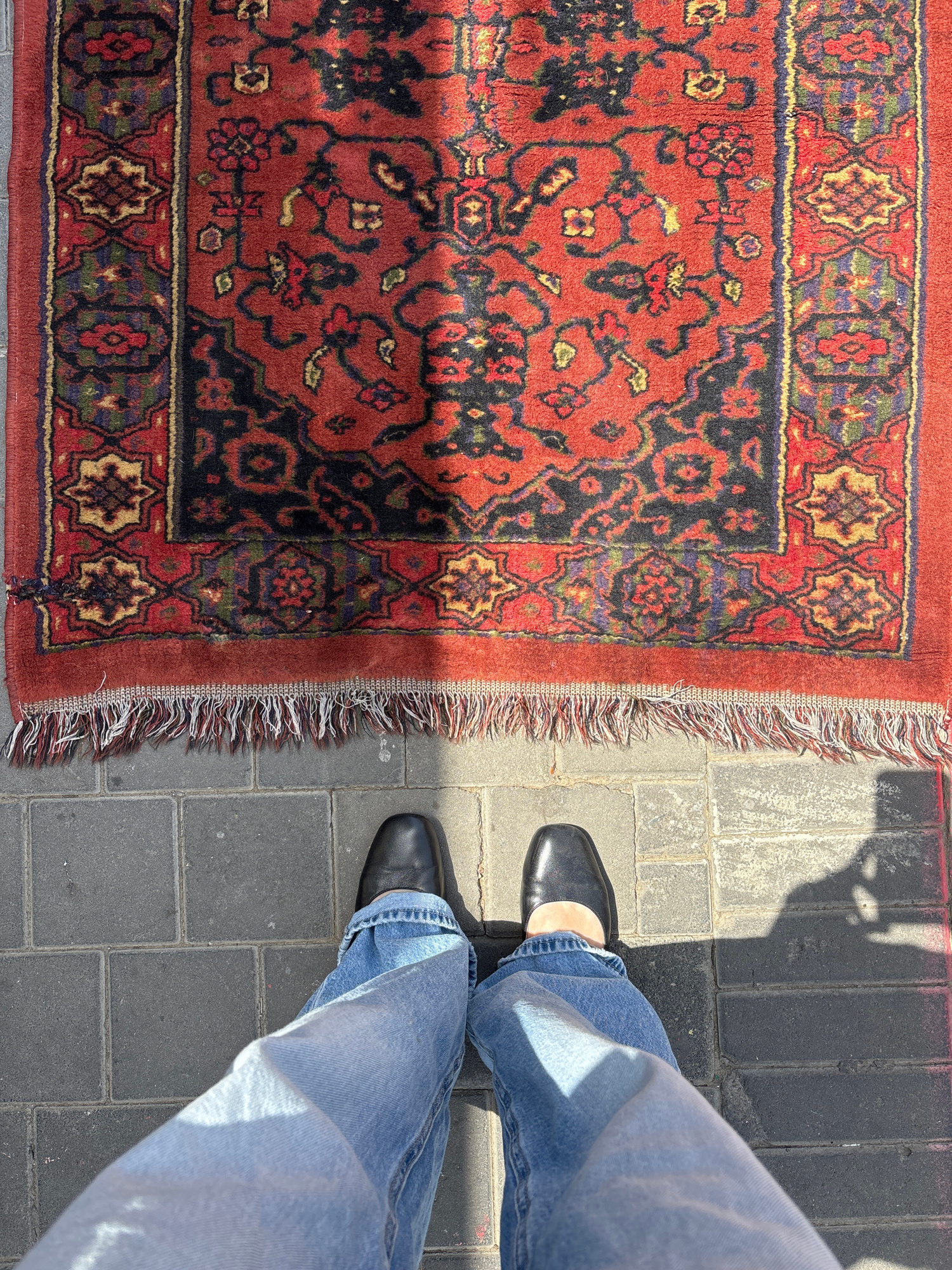 A top-down shot shows the lower half of a person wearing light blue jeans and black shoes, standing on a gray brick-paved surface next to a red oriental rug. The rug has a fringe edge, and a complex p…read more