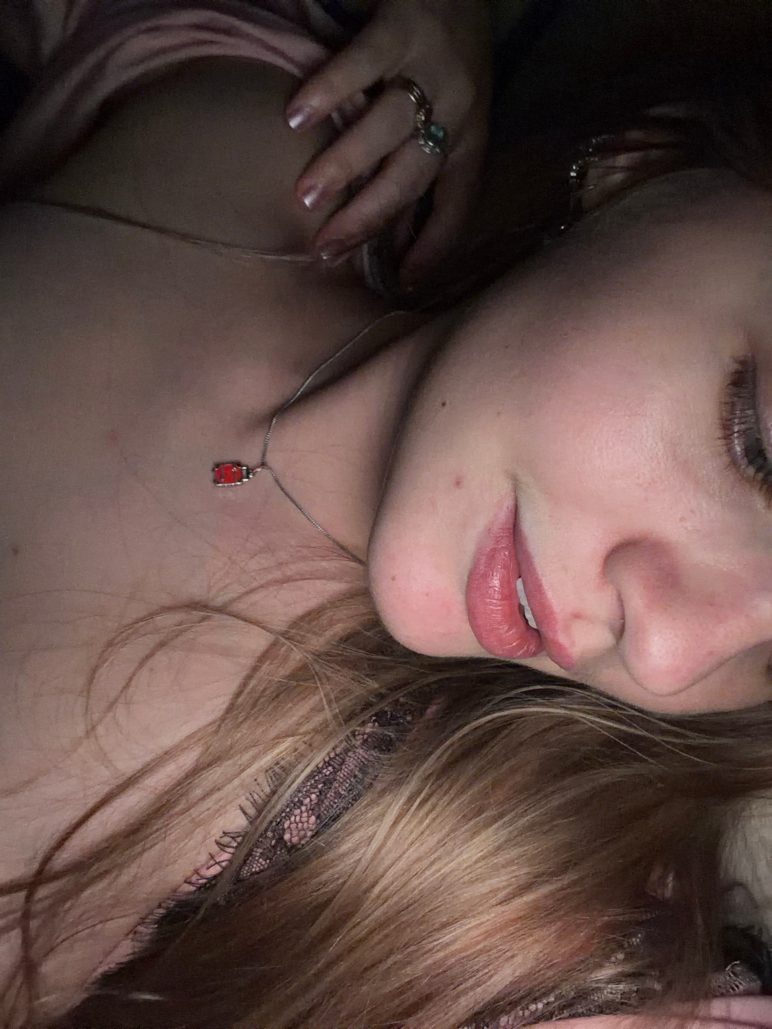 The image shows a close-up of a woman's face and upper body. She has light skin, blonde hair, and is wearing a silver necklace with a small red pendant. Her lips are slightly parted. A hand with rings…read more
