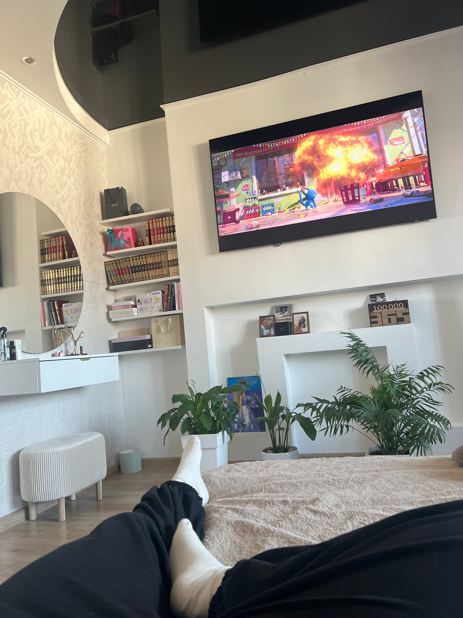 The image shows a portion of an interior with a TV displaying an animated scene, a shelving unit, and a figure in the foreground. The shelving unit features books, decorative items, and plants. The fi…read more