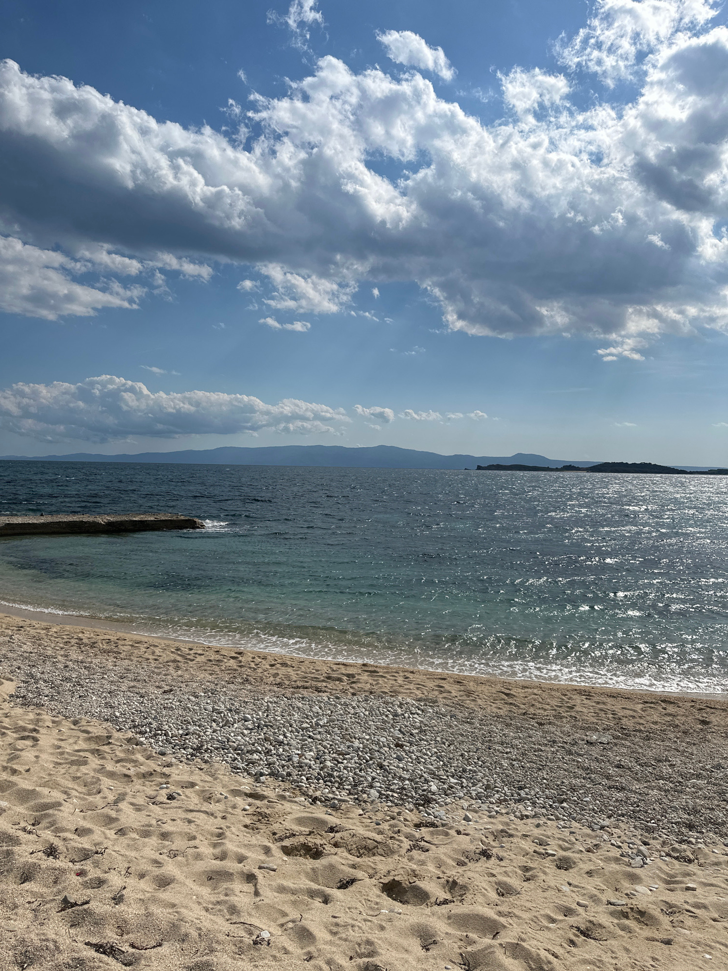 The image shows a beach scene in Ouranoupoli, Greece. The view is oriented vertically, with the sky and clouds on the left, the sea in the center, and the beach on the right. The sky is a light blue…read more