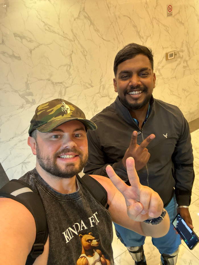 Two men are posing for a selfie. One man is wearing a black jacket, blue jeans, and white sneakers. He's holding a phone and making a hand gesture. The other man is wearing a camouflage hat and a blac…read more