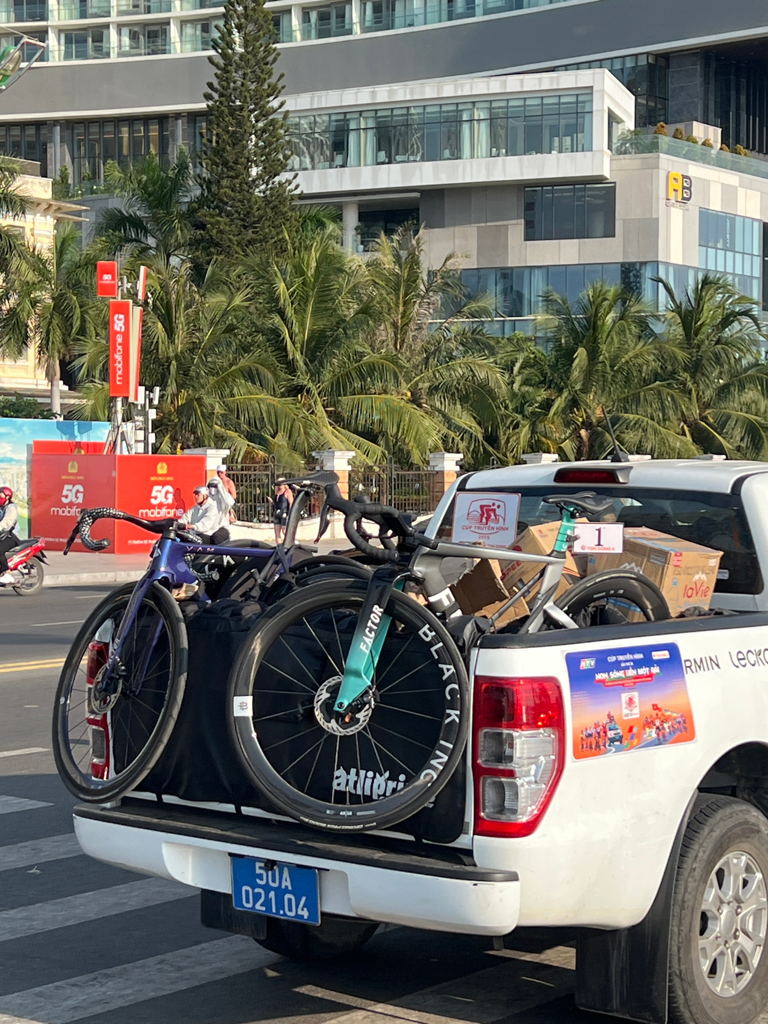 The scene depicts the back of a white pickup truck loaded with cardboard boxes and two racing bicycles, a blue "VAM" Factor and a black "INC" Factor, likely being used for a cycling competition. A spare tire is strapped on the rear of the truck bed, and the license plate reads "50A 021.04." The truck has stickers and advertisements related to the cycling competition, including one that reads "CÚP TRUYỀN HÌNH NON SÔNG TIỀN MỘT DÀI," or "Television Cup, Non Song Tien one Dai", and "CÚP TRUYỀN HÌNH 2026" or "Television Cup 2026." In the background, there are buildings and palm trees, and a red "mobifone 5G" advertisement, indicative of Nha Trang, Vietnam. The foreground shows a crosswalk. | Open Wire