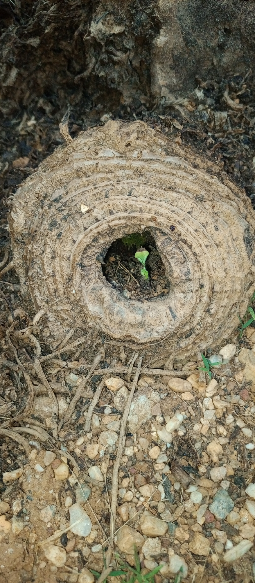 A close-up shot of a plant stump in Tinaquillo, Venezuela. The stump is circular with rings, and there's a hole in the center where a small green plant is growing. The area around the stump is covered…read more