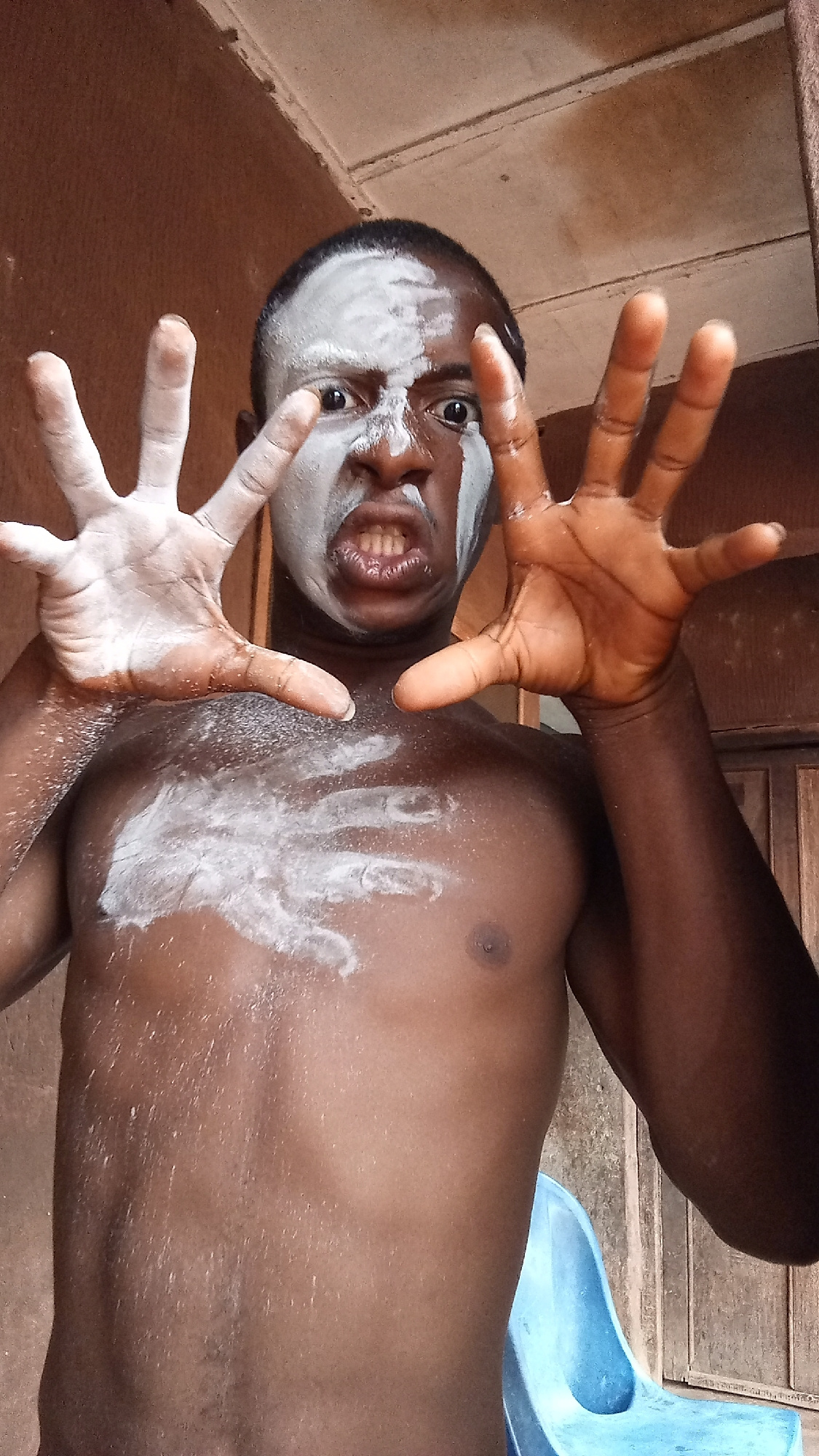 A shirtless, dark-skinned man is posing indoors, likely in a residential setting. He has a portion of his face and upper chest covered in a white powdery substance. His eyes are wide, and his expressiβ¦read more