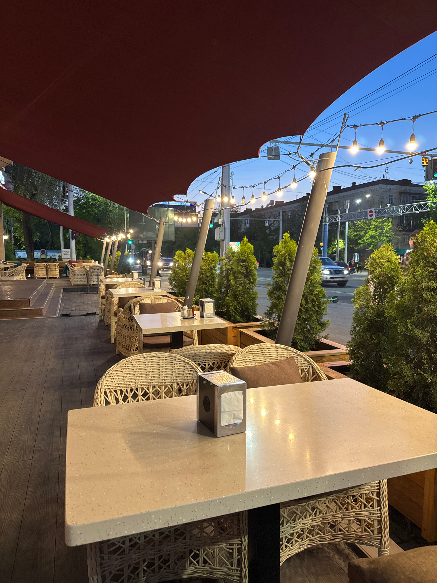 The image presents an inviting outdoor cafe or restaurant seating area at dusk, situated alongside a city street in Almaty, Kazakhstan. The setting suggests a calm evening atmosphere, with artificial…read more