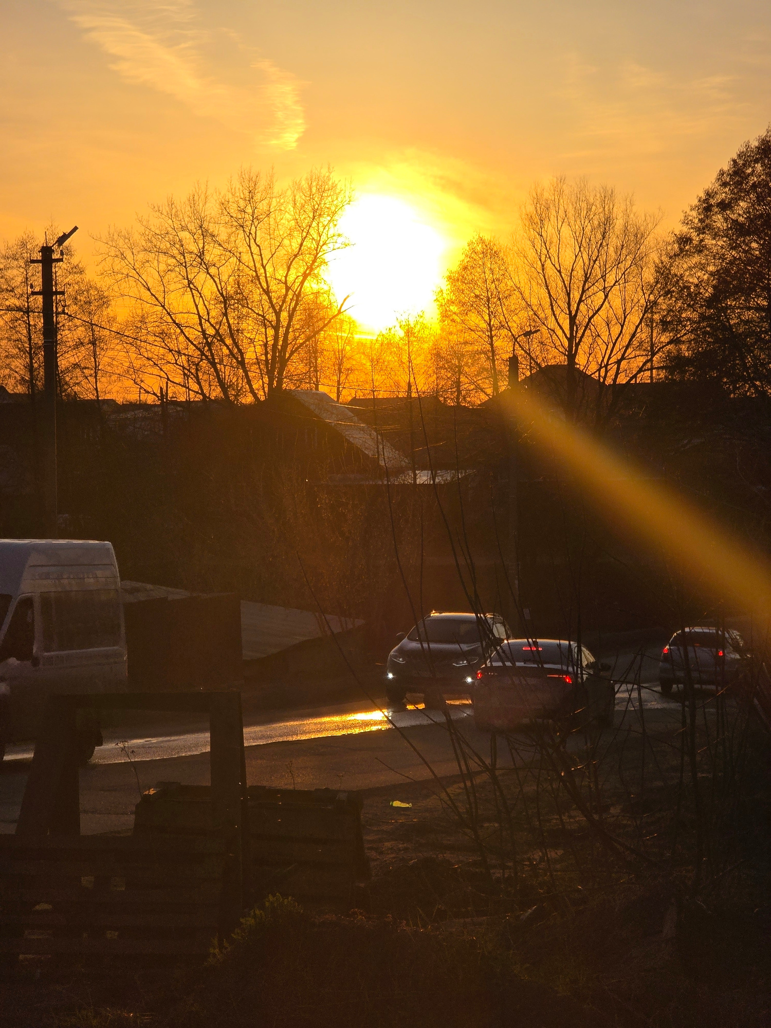 The image captures a sunset scene in Chaikovsky, Russia. The sun is intensely bright and low on the horizon, partially obscured by bare tree branches. The sky is a gradient of orange and yellow hues.…read more