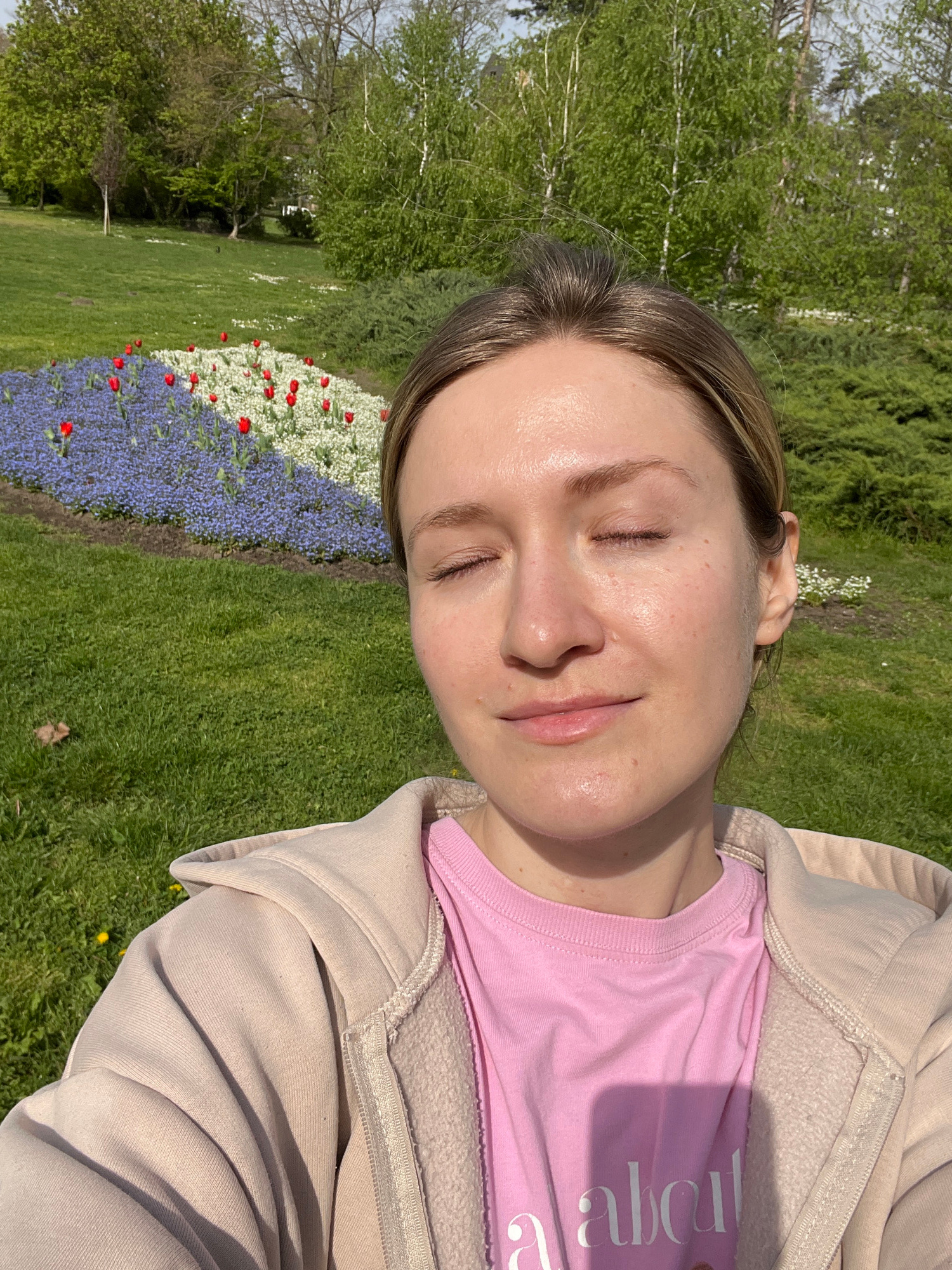 The image is a close-up selfie of a woman lying on green grass near a flowerbed. The woman has fair skin, light brown hair, and closed eyes. She is wearing a pink t-shirt with white text and a beige h…read more