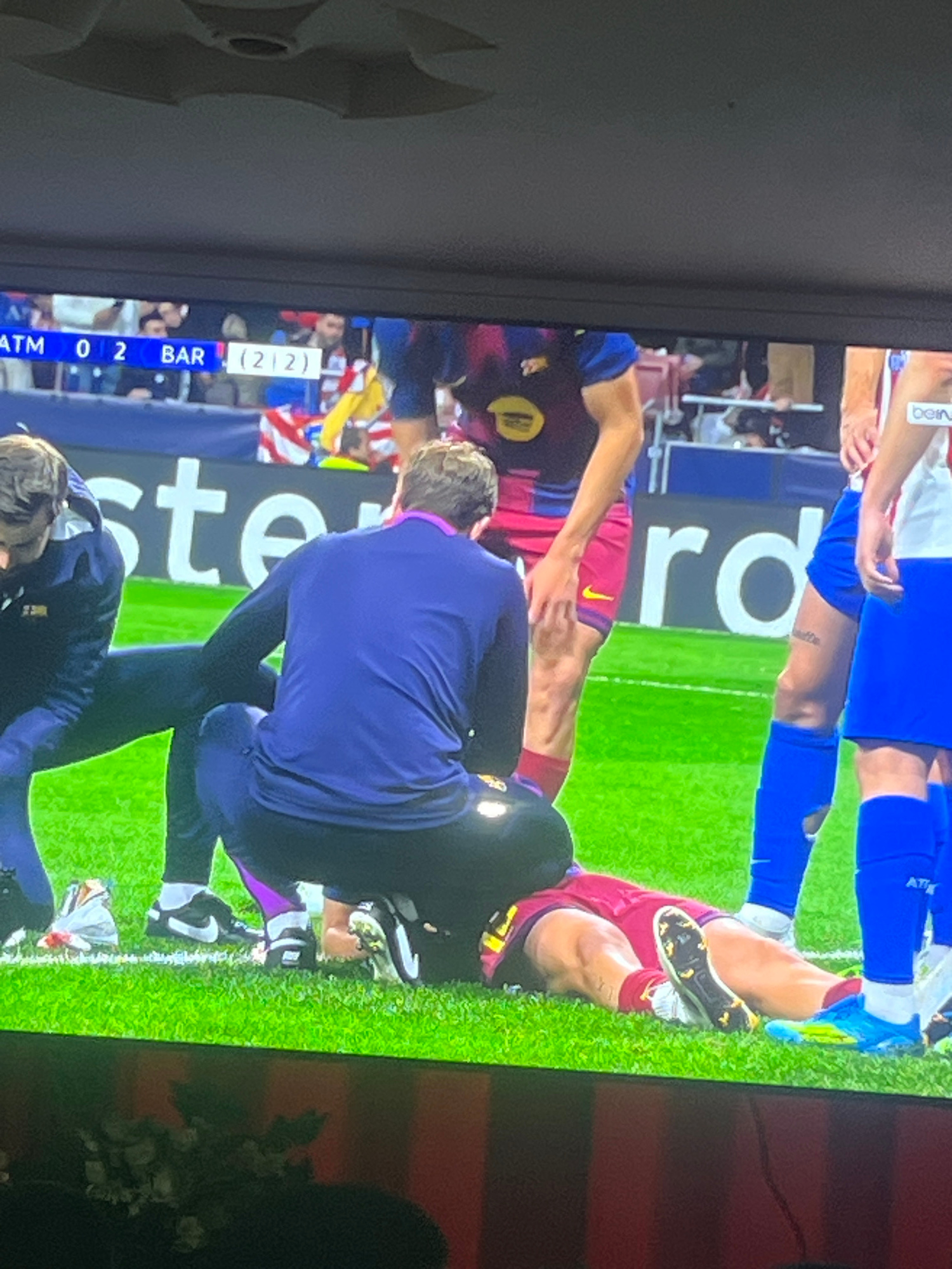 A television displays a soccer game, where a player in a red and blue uniform lies injured on the green field, being tended to by medical staff in blue uniforms. The score is ATM 0, BAR 2, with the ga…read more