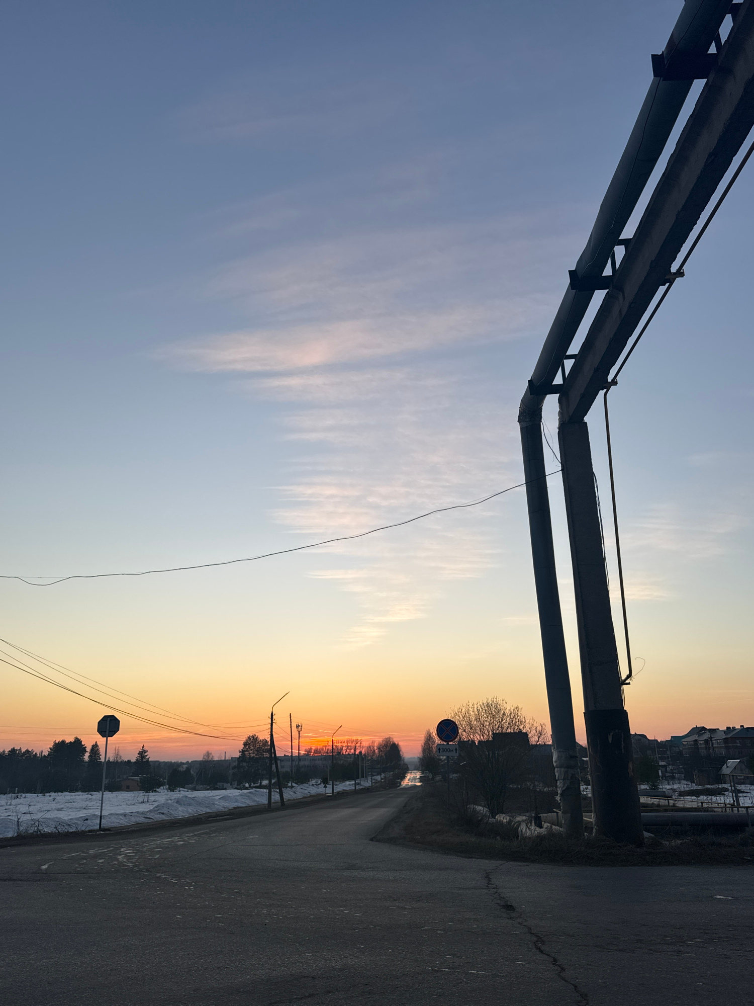 This is a photograph taken in Прикамский, Russia. The image is oriented vertically and shows an urban scene during a sunrise or sunset. On the left side of the image, there are gray metallic pipes sup…read more