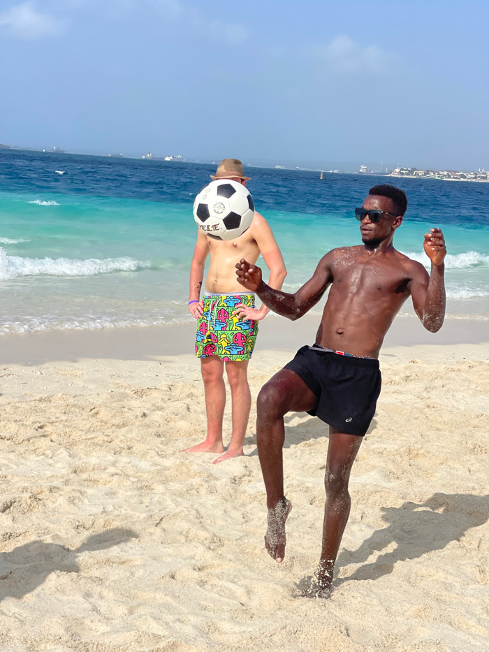 The image displays a beach scene in Zanzibar, Tanzania. Two males are present on a sandy beach under a clear, light blue sky. In the foreground, a male with dark skin stands shirtless, wearing black…read more
