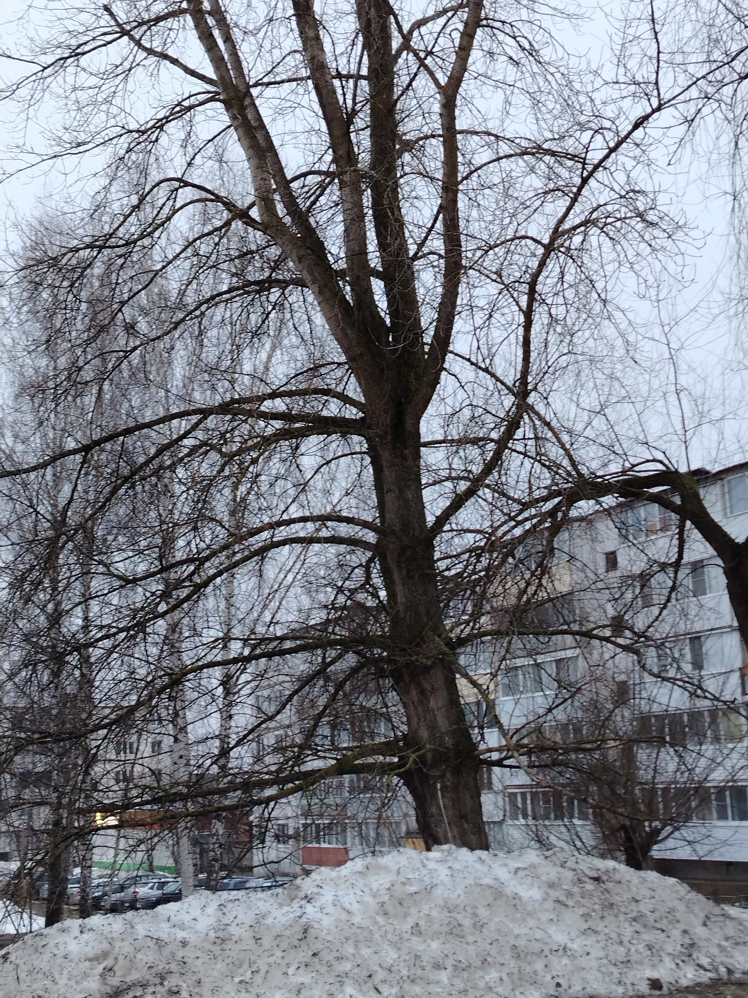 The image shows a bleak winter scene in what appears to be a residential area. In the foreground is a large pile of dirty snow. Behind the snow, several bare trees dominate the view, their branches stβ¦read more