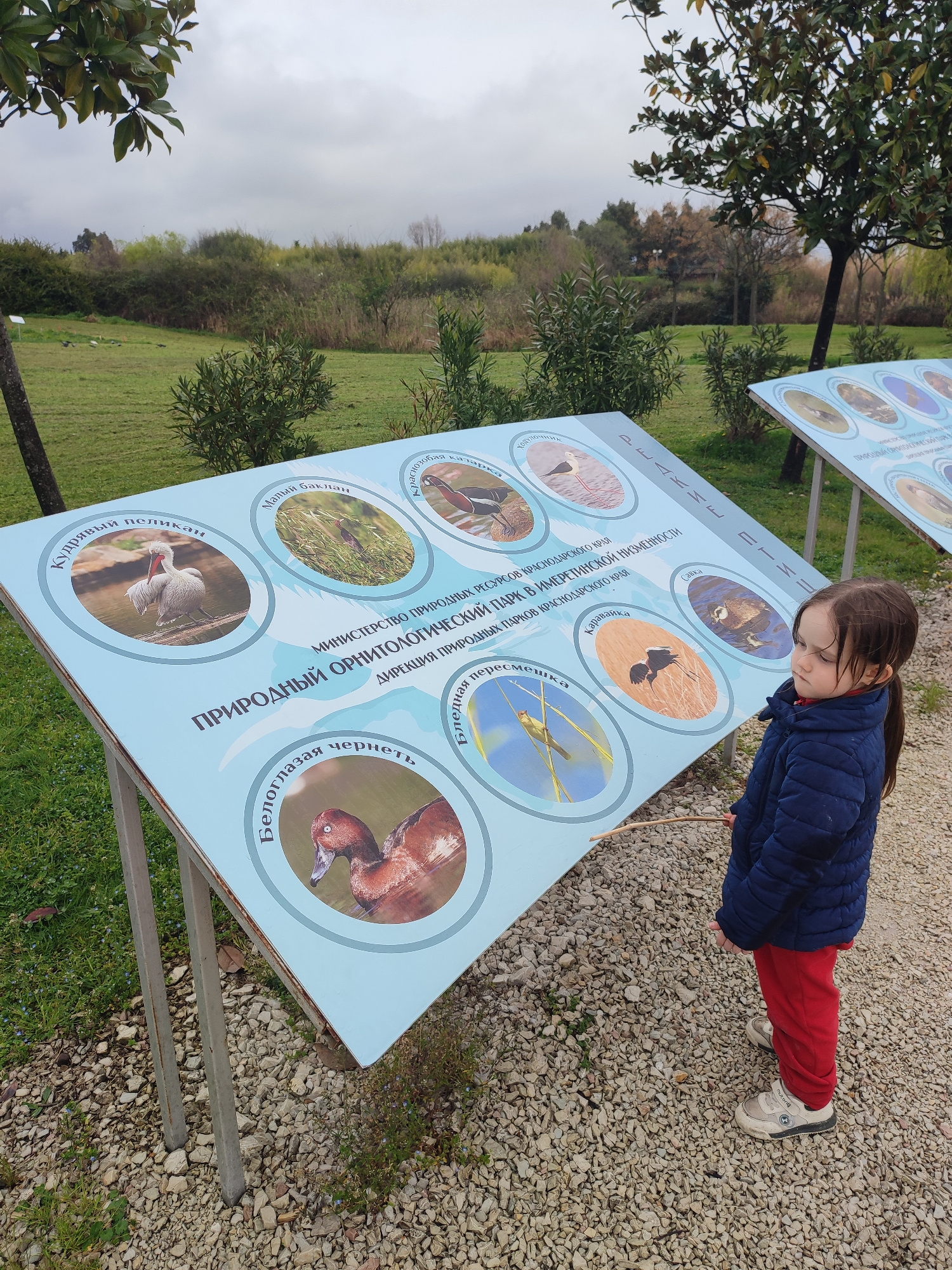 Here is a description of the image: A young girl in a blue jacket and red pants stands beside an outdoor information board in what appears to be a park or nature reserve. The board is tilted and disp…read more