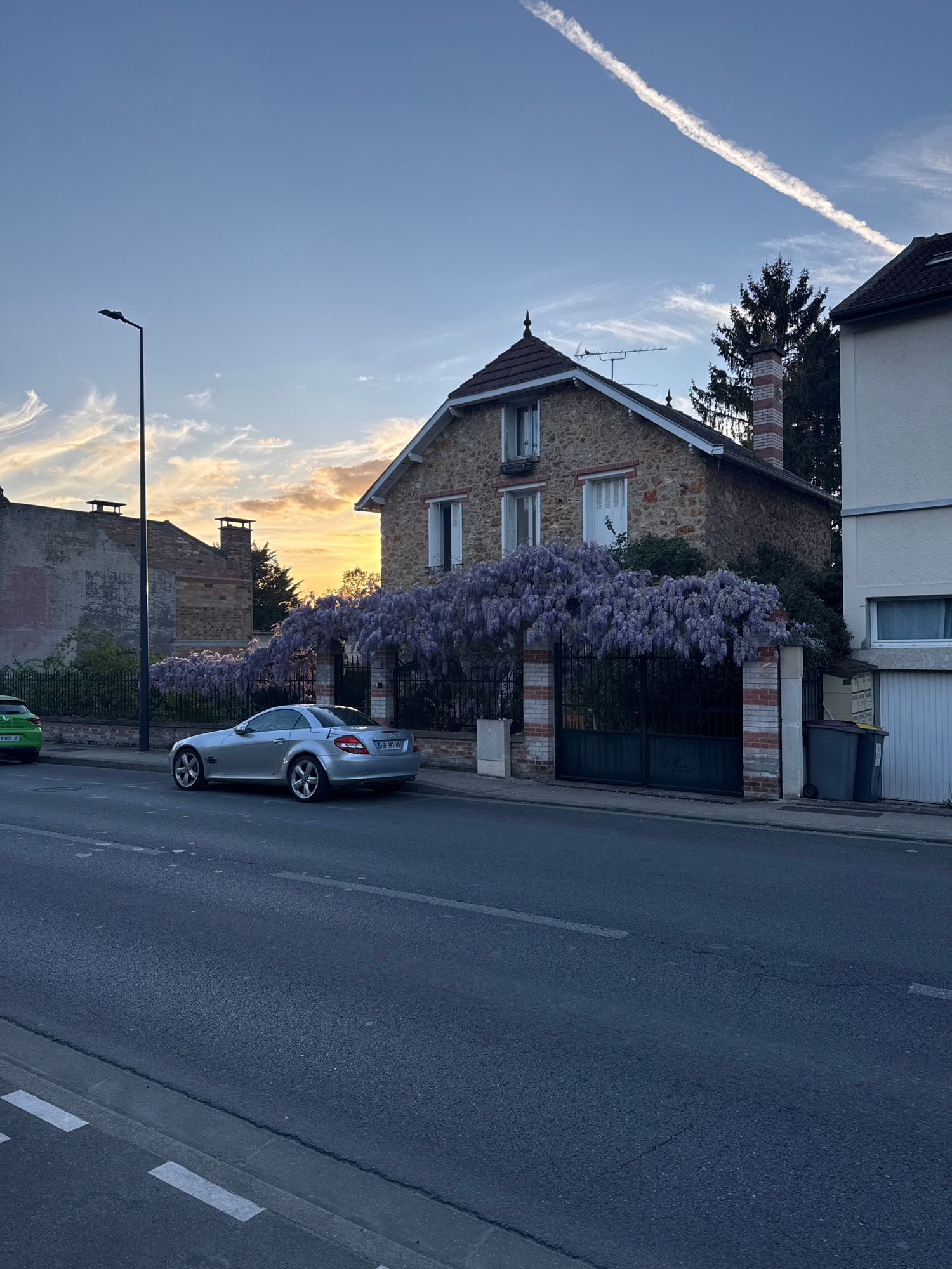 The image depicts a serene street scene in Bures-sur-Yvette, France, observed during late afternoon or early evening, characterized by a mix of natural light and twilight hues. The sky is predominantl…read more