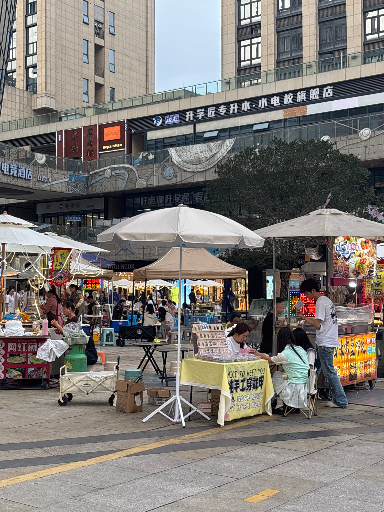 Here's a detailed description of the image: **Overall Impression:** The image captures a bustling outdoor market scene. Several stalls are set up along a pedestrian walkway, each covered by white um…read more