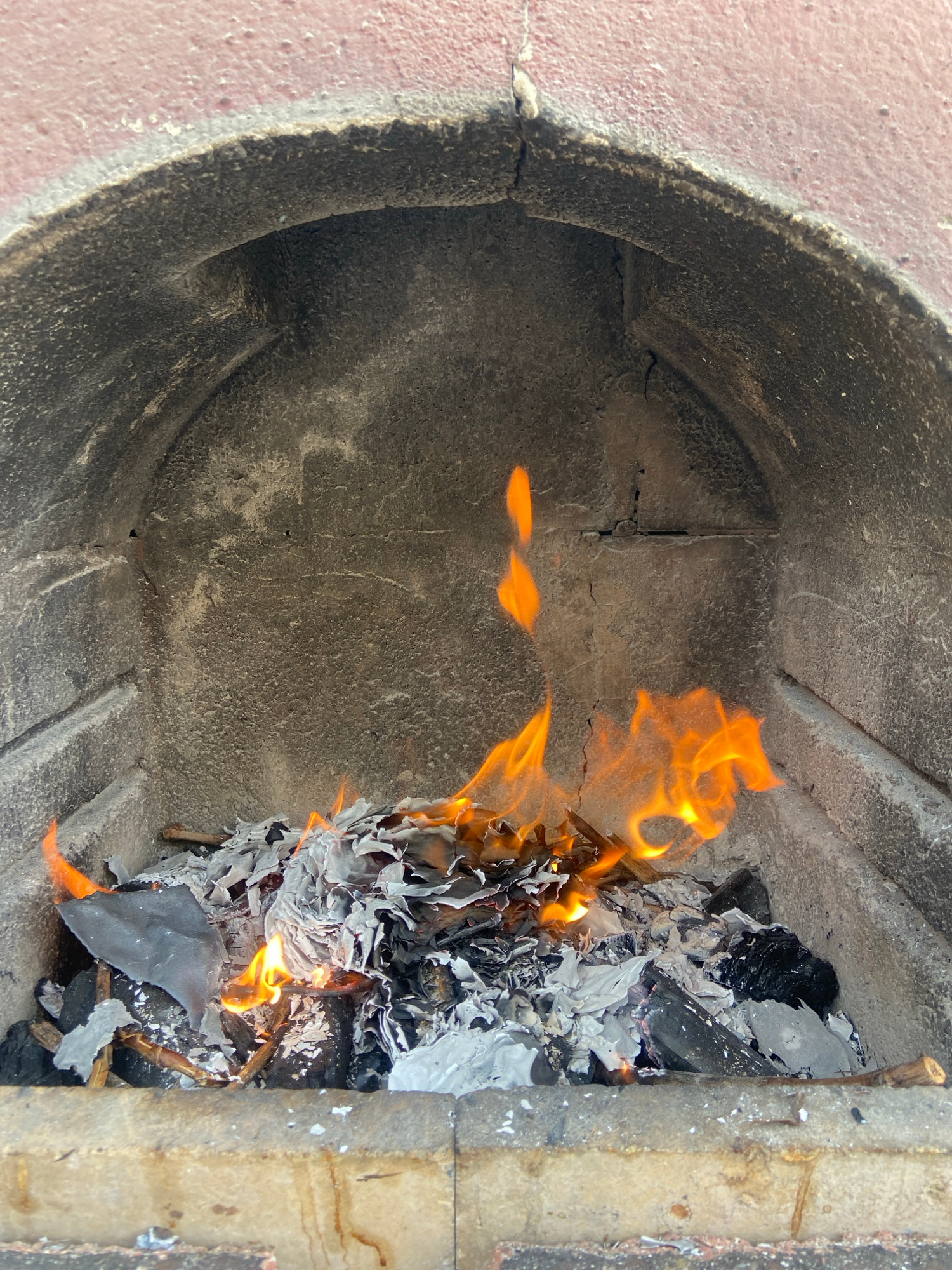 A fire burns within a gray brick or concrete structure. The flames are orange and yellow and are consuming crumpled, white and gray paper or material. The structure's interior appears to be aging or w…read more
