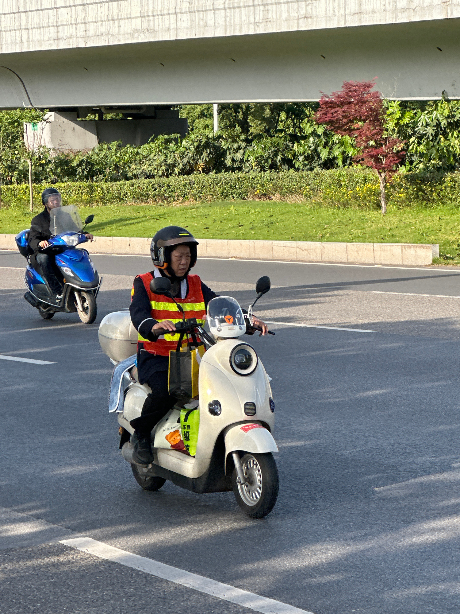 The image displays two individuals on scooters on a paved road in what appears to be an urban or suburban environment in Jiangjin, China, under clear, sunny daytime conditions with long shadows indica…read more