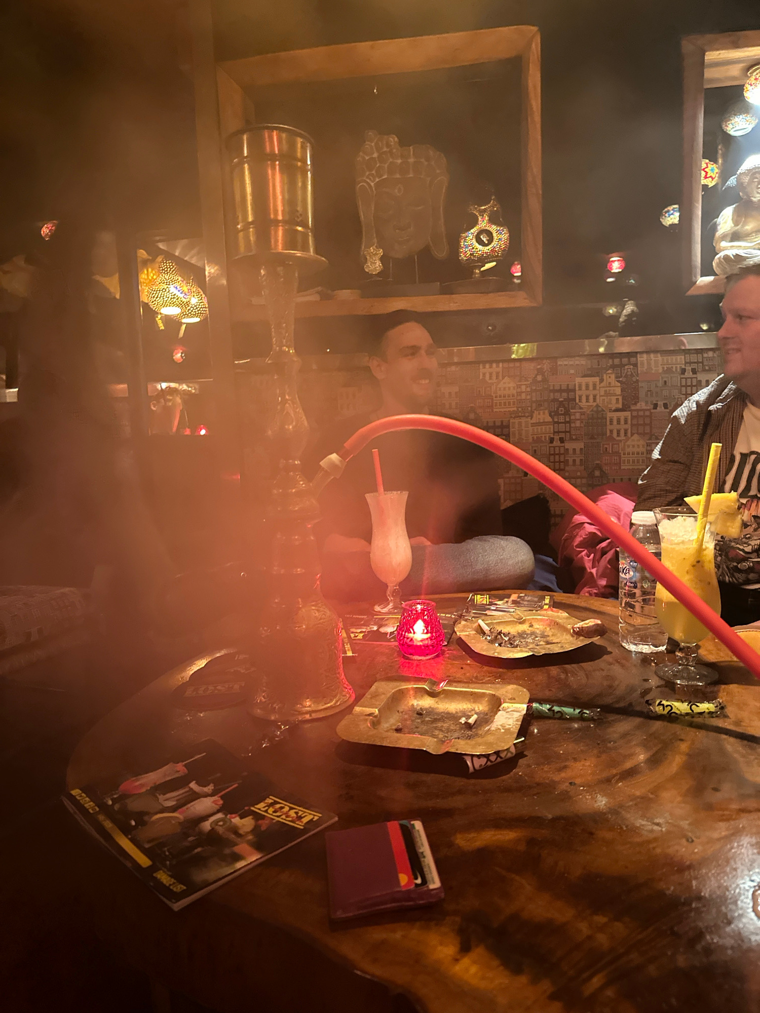 The image depicts a dimly lit interior, possibly a hookah bar or lounge, located in Amsterdam, Netherlands. There are two people visible: a man in his late 20s or early 30s is smiling directly at the…read more