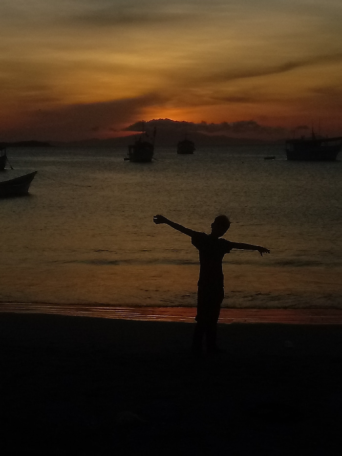 A silhouette of a person stands on a beach with arms outstretched against a sunset backdrop. The water reflects the orange and yellow hues of the sky, where a layer of clouds partly obscures the settiβ¦read more