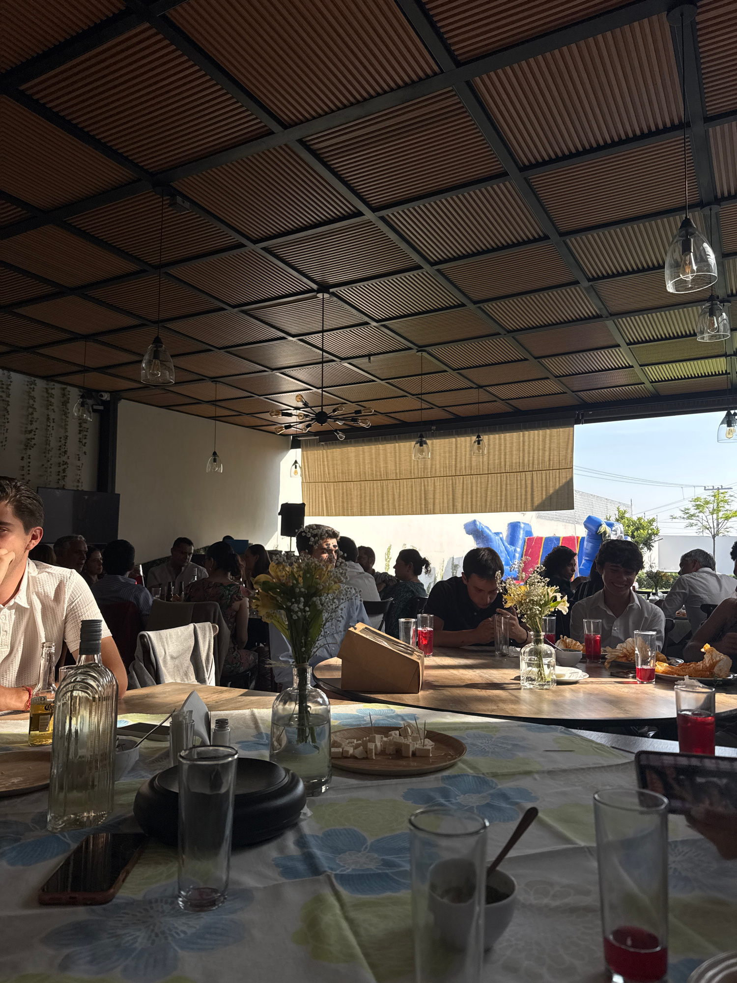 A group of people are seated at a long table in a covered outdoor restaurant. The table is set with flowers, drinks, and food. The restaurant has a distinctive ceiling with a grid pattern and hangingβ¦read more