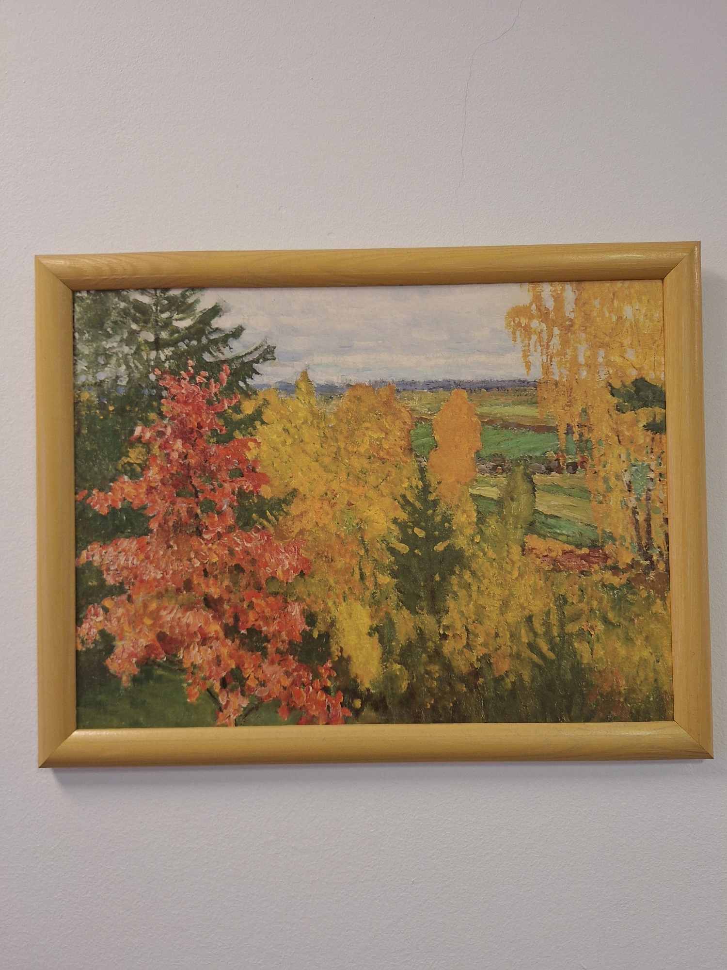 A framed painting hangs vertically on a white, textured wall. The frame is made of light-colored, possibly light wood, and has a simple, rectangular profile. The painting itself depicts an autumn lan…read more