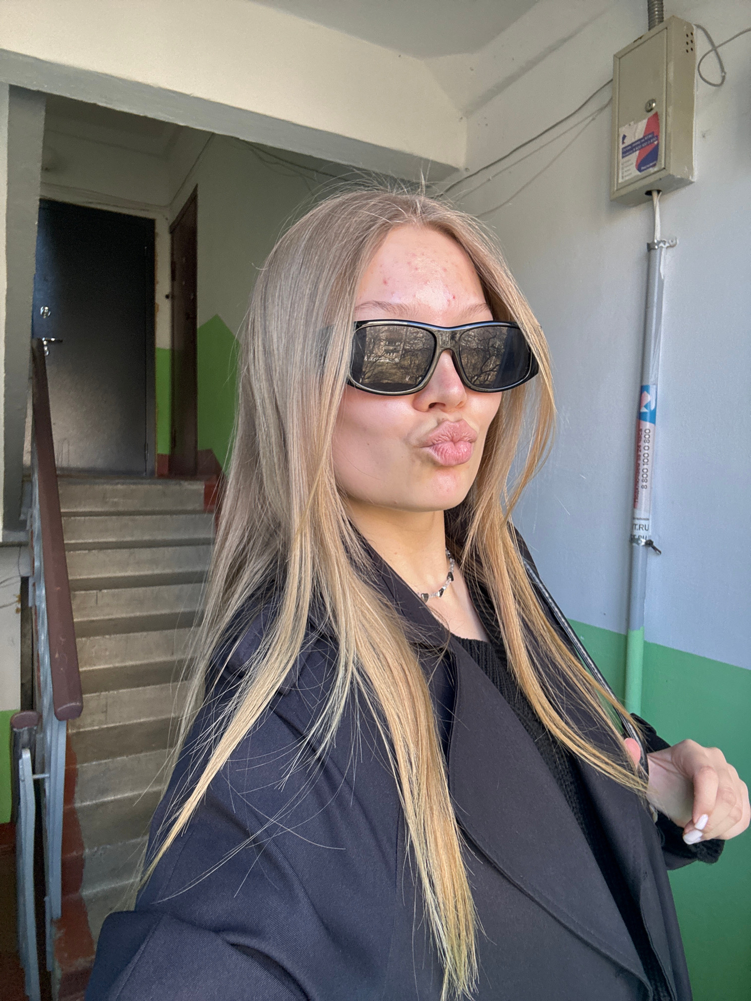 A photograph taken in a stairwell-like location in Chaikovsky, Russia. The subject is a blonde woman wearing dark sunglasses and a black coat. She has her hair in a cascade down her side. She is pursi…read more