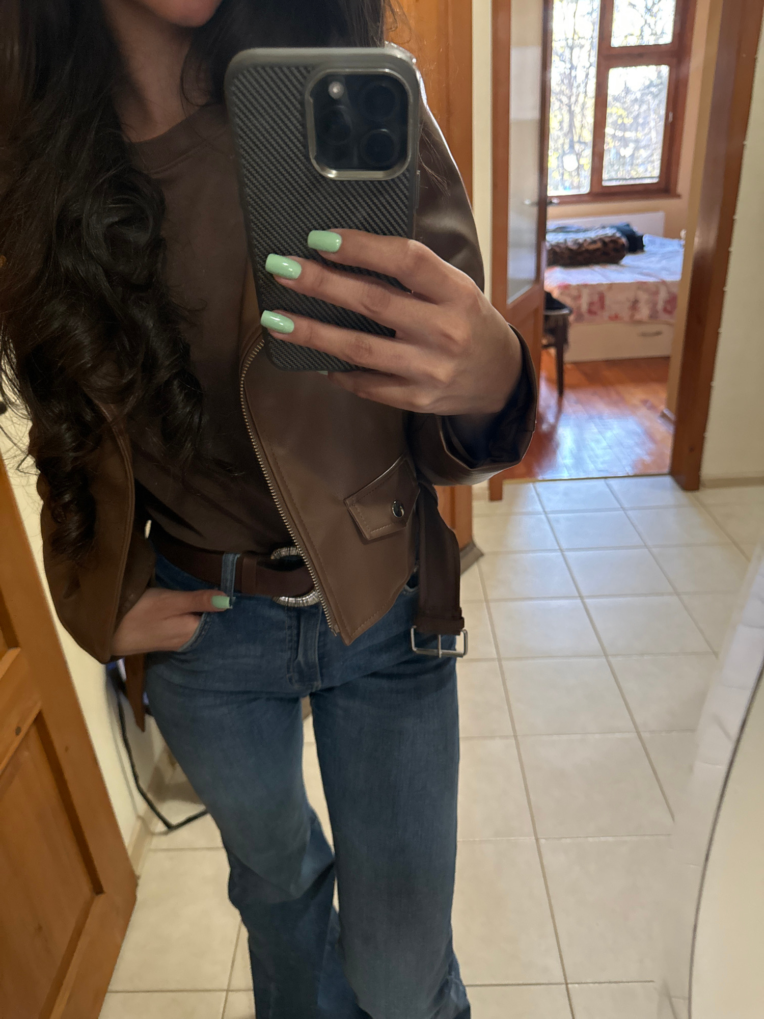 A person with dark curly hair is taking a selfie with an iPhone. The person is wearing a brown leather jacket, blue jeans with a brown belt. The person has light green nail polish. The background incl…read more