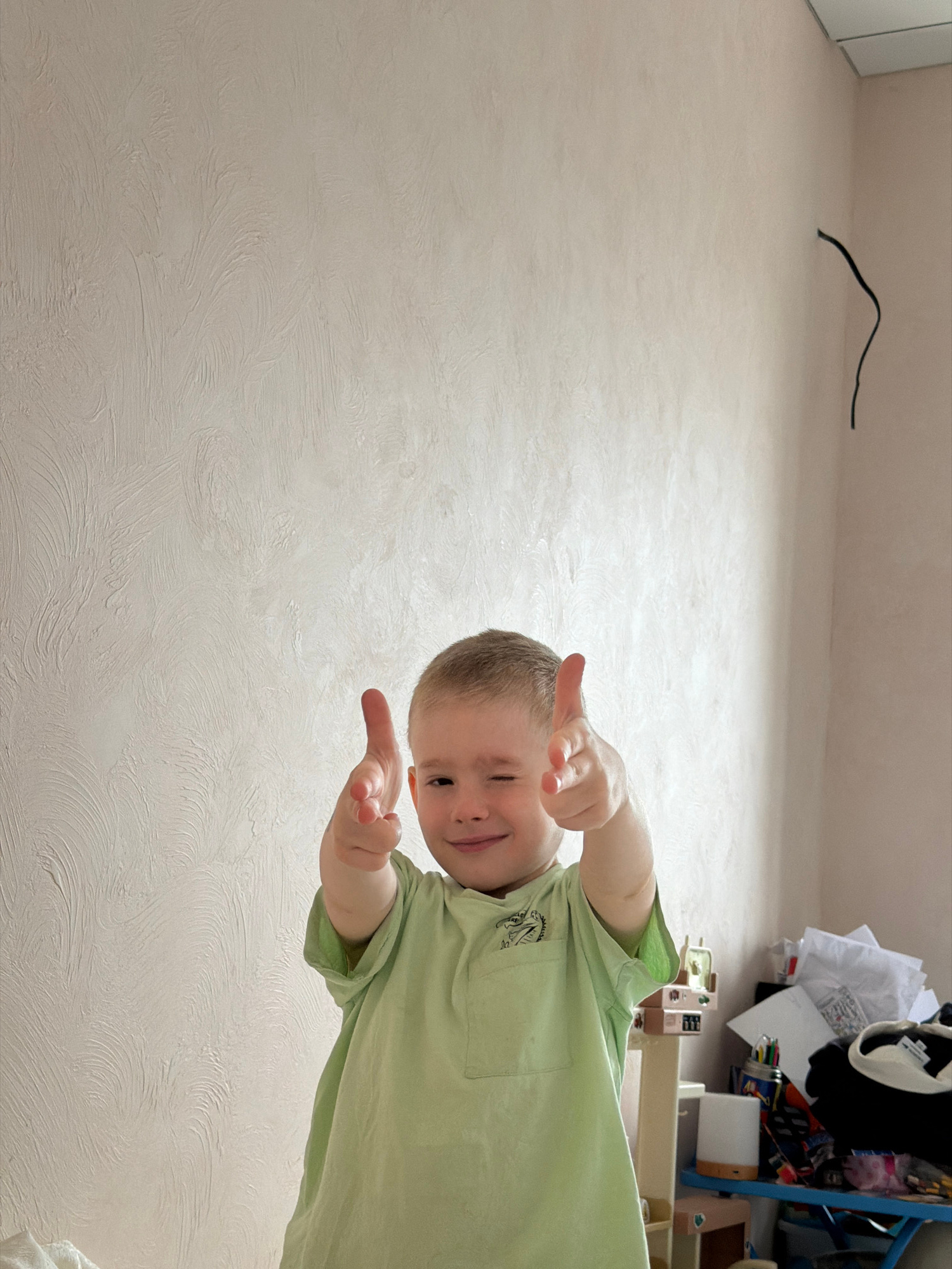 A boy with short, light-brown hair stands facing the camera, wearing a light-green t-shirt with a cartoon dinosaur on the pocket. He is smiling and pointing his index fingers and thumbs towards the ca…read more