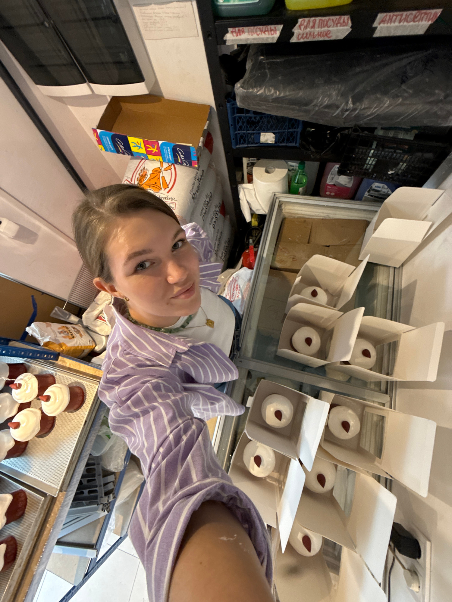 A young woman in a striped purple shirt is taking a selfie in what appears to be a commercial kitchen or bakery, likely in Belgrade, Serbia, based on the Cyrillic text on some of the cleaning product…read more