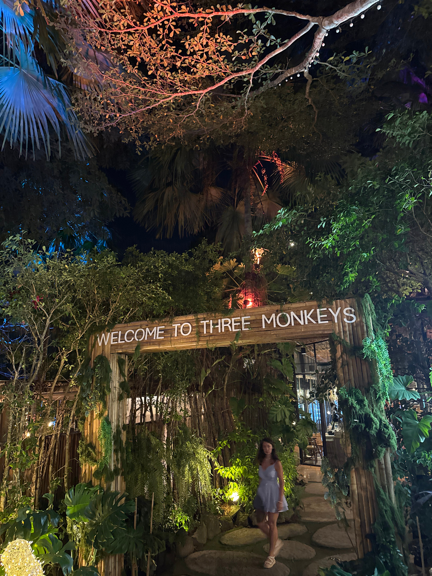 The image depicts the warmly lit, tropical entrance of a venue at night in Wichit, Thailand. Dominating the center is a vertical wooden sign, prominently displaying the text "WELCOME TO THREE MONKEYS"…read more