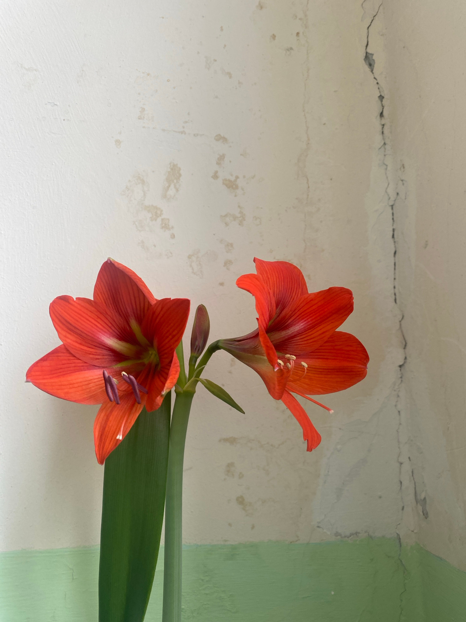 The image captures two vibrant orange Amaryllis flowers against a textured wall background. The flowers are positioned on the right side of the frame, emerging from thick green stems and broad green l…read more