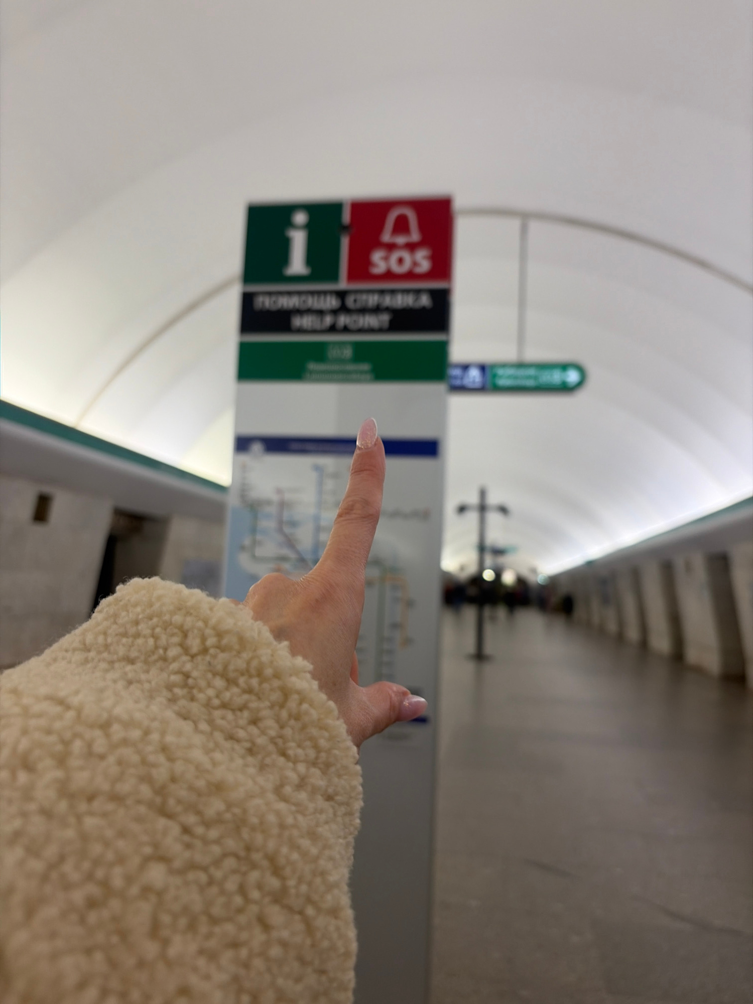 The image shows the platform of a Saint Petersburg metro station, likely one of the newer stations with a modern design, given the curved white ceiling and the information pillars. The pillars contain…read more