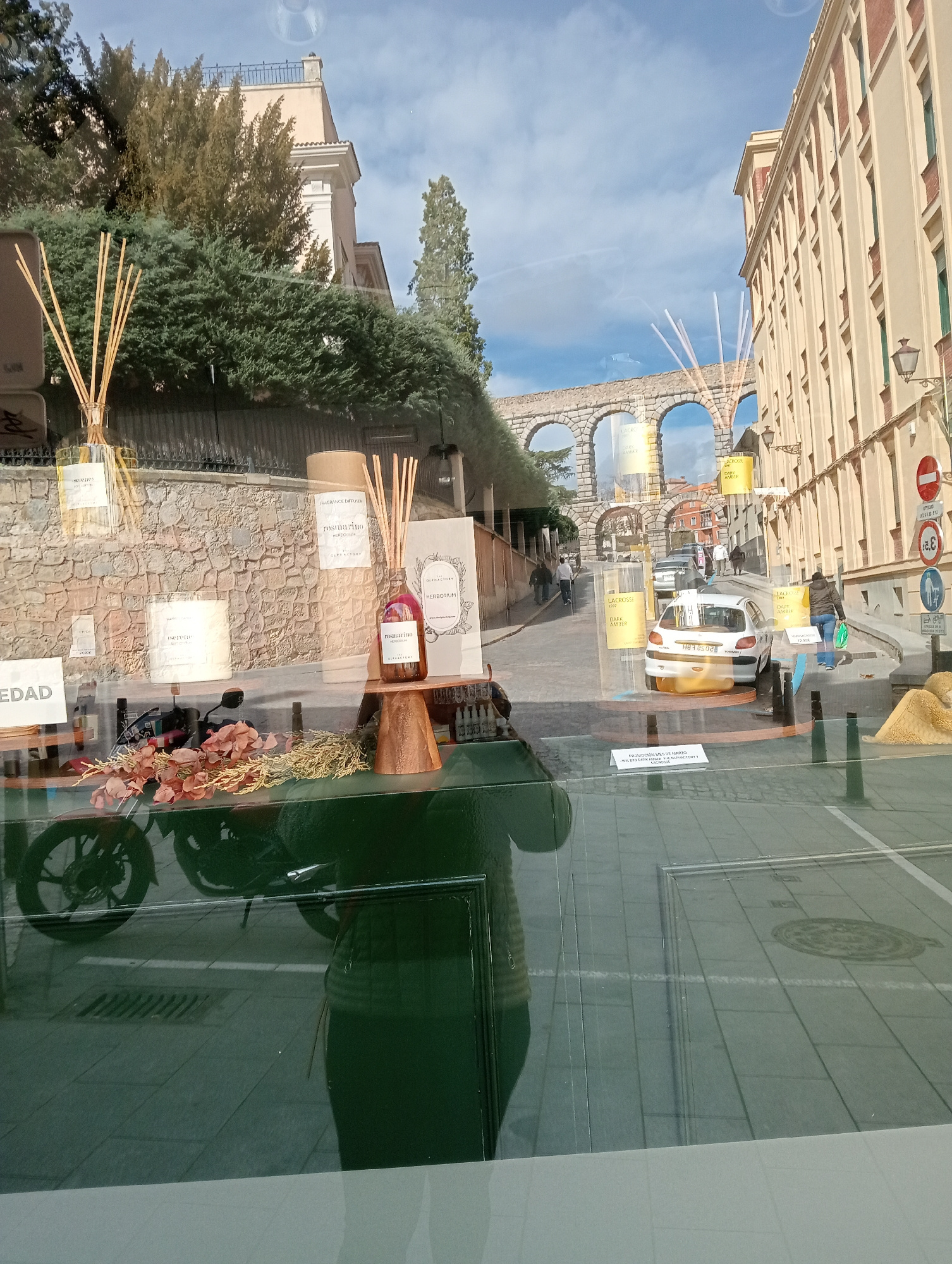 The image, taken from behind a shop window, showcases a view of the ancient Roman aqueduct in Segovia, Spain. The shop's display features various fragrance diffusers and decorative items, partially ob…read more