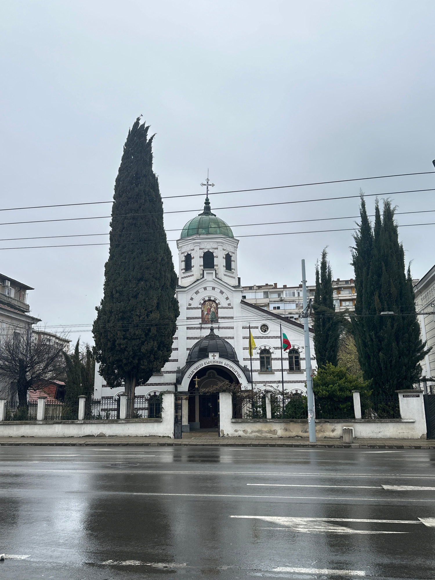 The image depicts a street scene in Stara Zagora, Bulgaria, taken on a cloudy day, likely after rain, judging by the wet pavement. The prominent subject is the "Храм Свето Благовещение Богородично" ch…read more