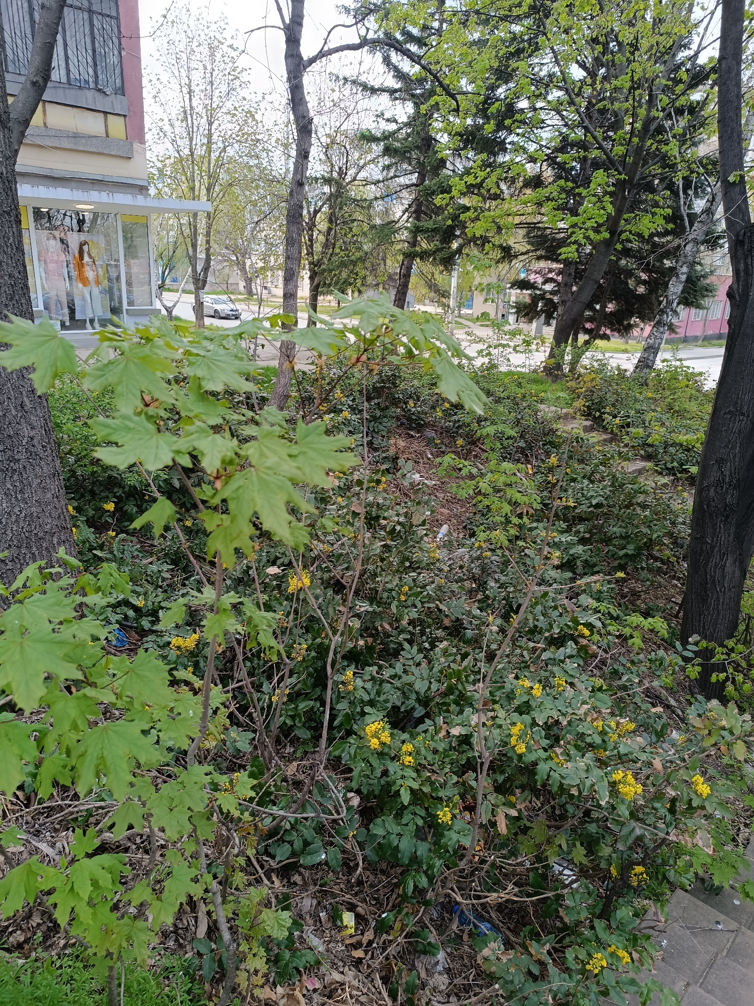 The image shows an urban scene with a focus on a roadside vegetation area. In the foreground, there are bushes and a small tree with green leaves. These plants obscure parts of the background. Between…read more
