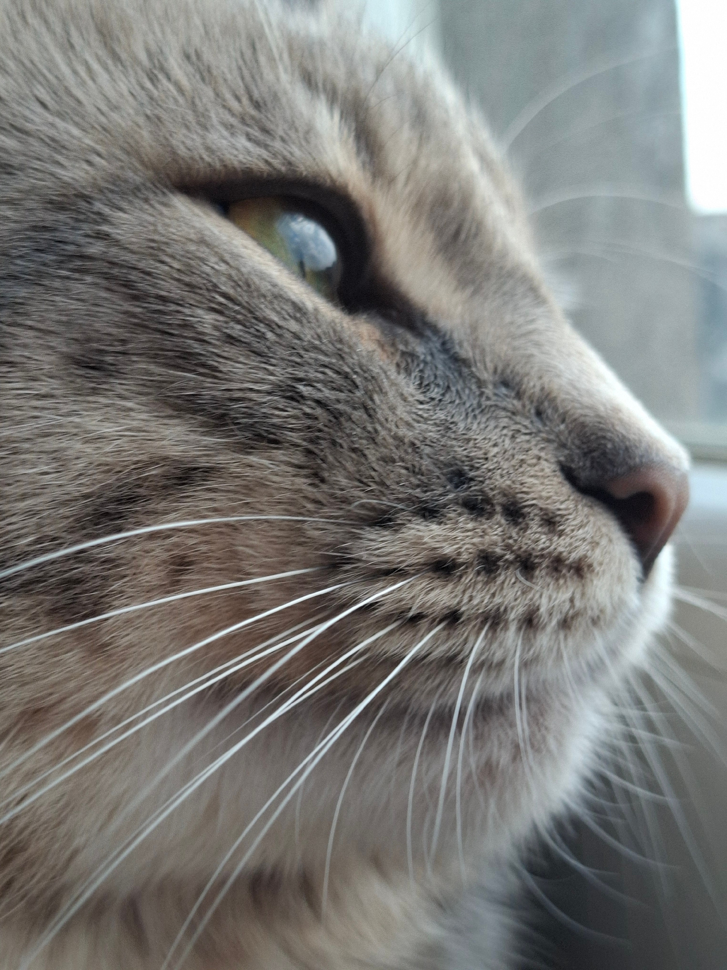 An extreme close-up shot captures the left side of a cat's head, viewed from a low angle looking upwards. The cat has a grey and brown patterned coat, indicative of a tabby or similar breed, with dist…read more