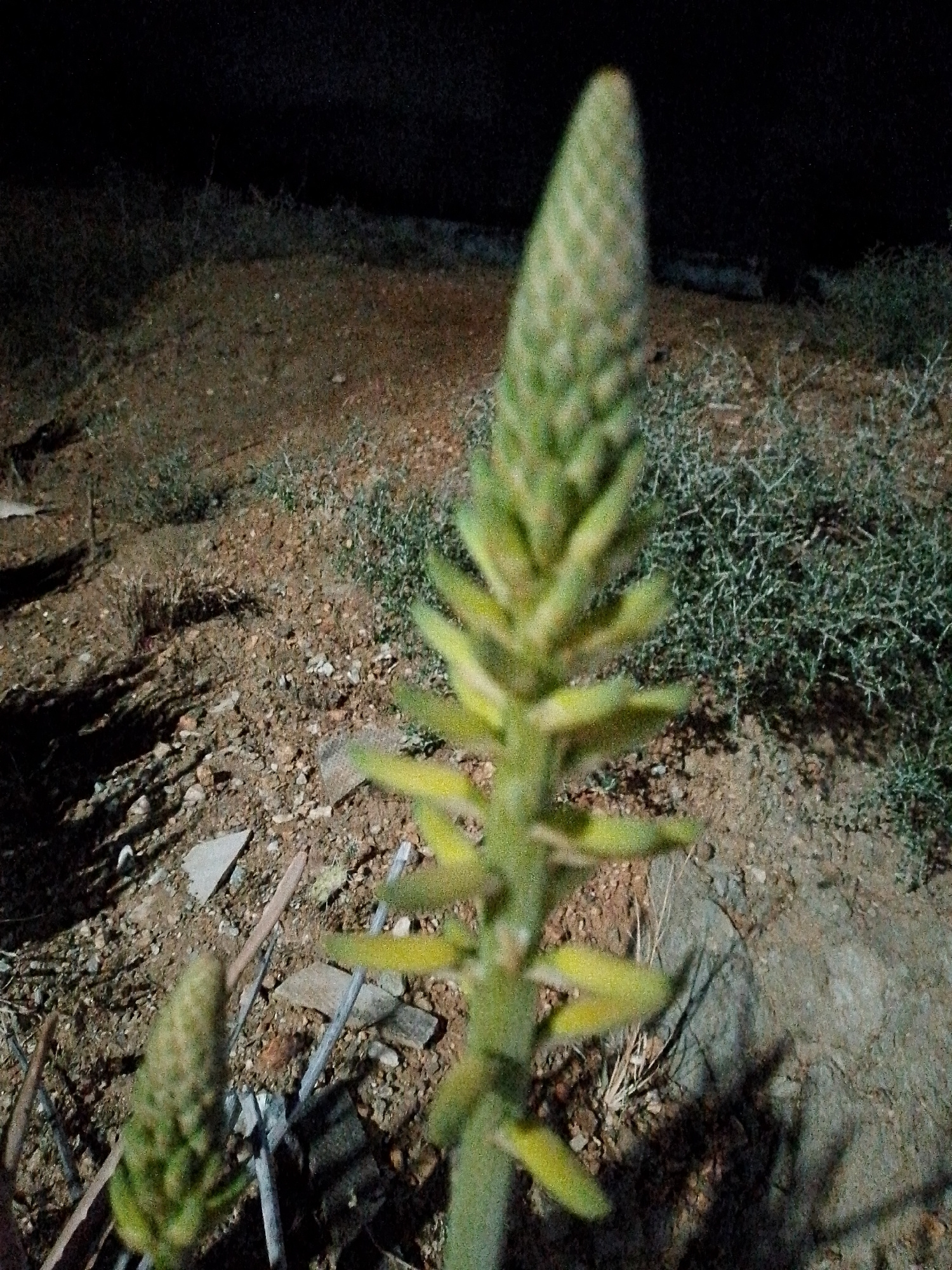 A close-up shot taken at night reveals two aloe plants in what appears to be an arid environment. The larger plant is the focal point, its tall, cone-shaped inflorescence reaching upward. A smaller al…read more
