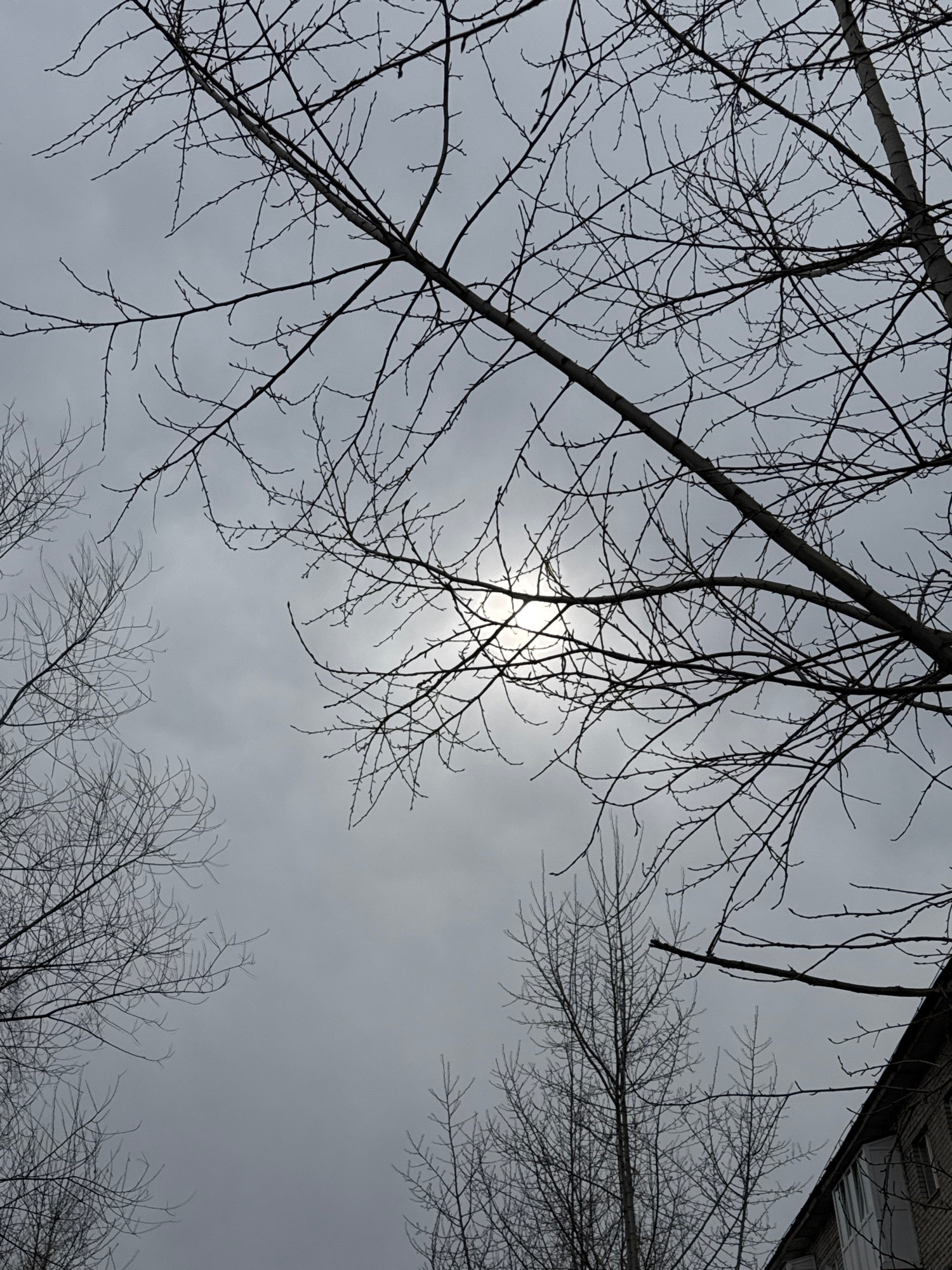 The image is an upward-looking shot of bare tree branches against a cloudy sky in Chernushka, Russia. The sun is obscured by the clouds, but its presence is indicated by a bright spot. The branches ar…read more