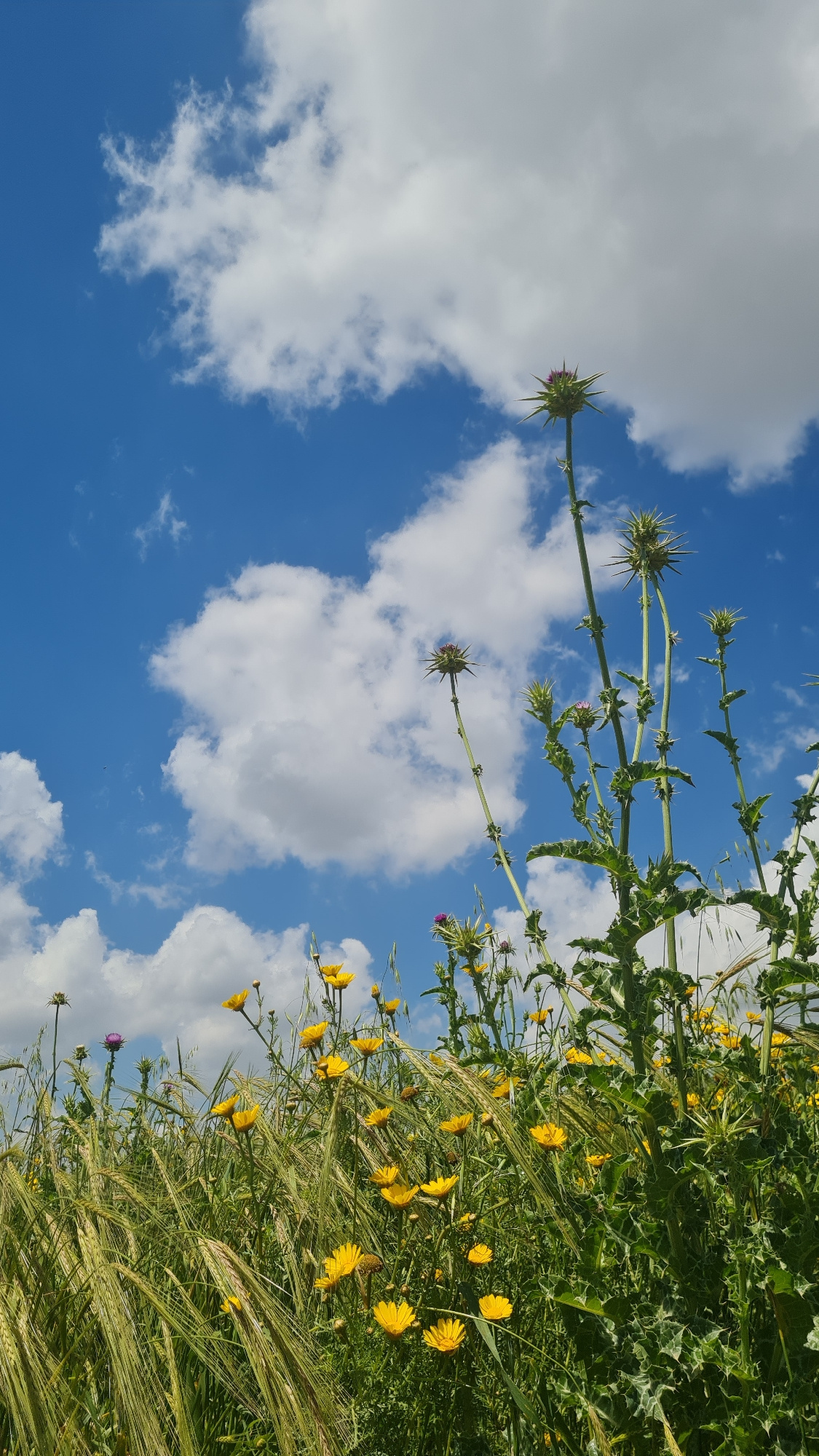 The image captures a natural scene in the Lachish Regional Council, Israel. A field of green vegetation, including yellow flowering plants and thistles with purple buds, occupies the left and lower po…read more