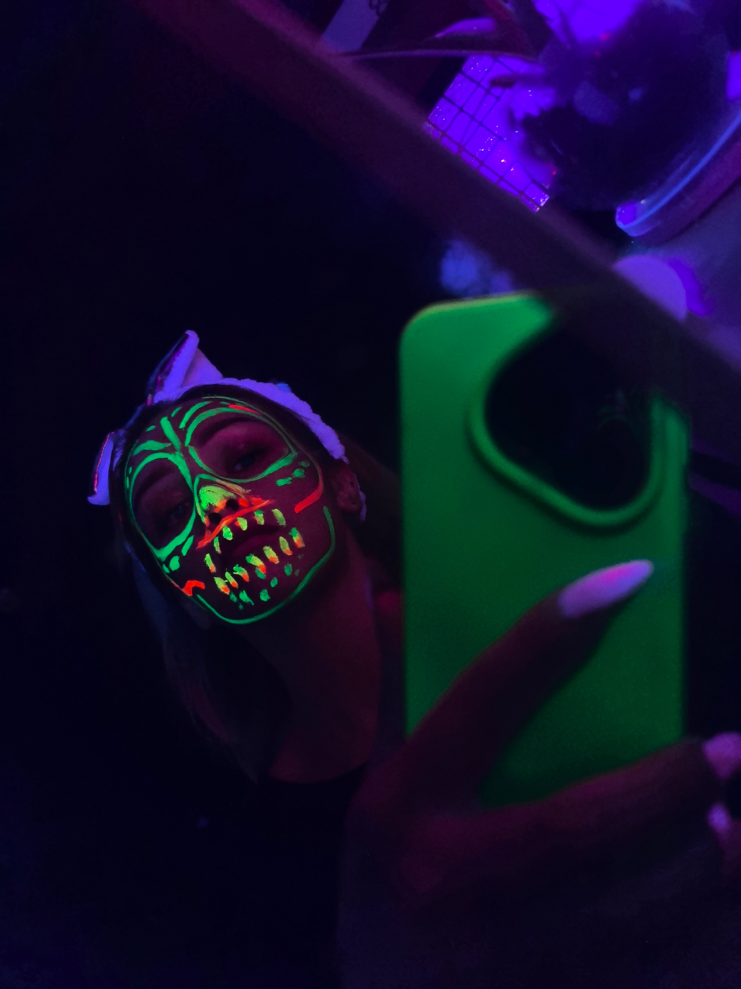 A person is taking a selfie in low light. The person has green and red face paint resembling a monster. They are holding a green phone. The background is dark with some purple lighting. It is not poss…read more