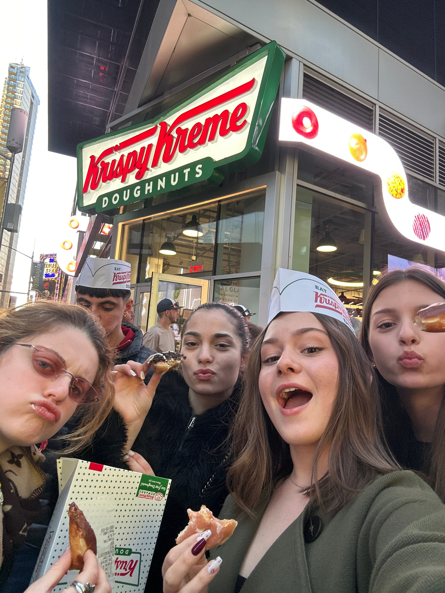 The image captures a group of five young women posing for a selfie outside a Krispy Kreme Doughnuts store. The store's prominent green and red logo sign is visible, along with a sign featuring illumin…read more