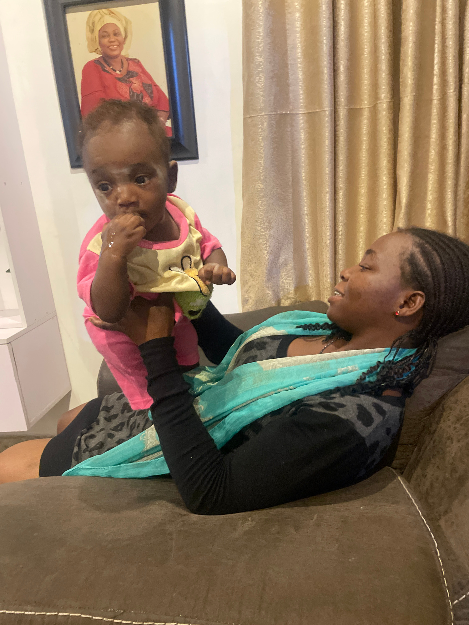 A woman and a baby are indoors. The woman, wearing a black long-sleeve shirt with a gray patterned undershirt, a turquoise scarf, and braids, is sitting on a brown couch. She is looking down at the ba…read more