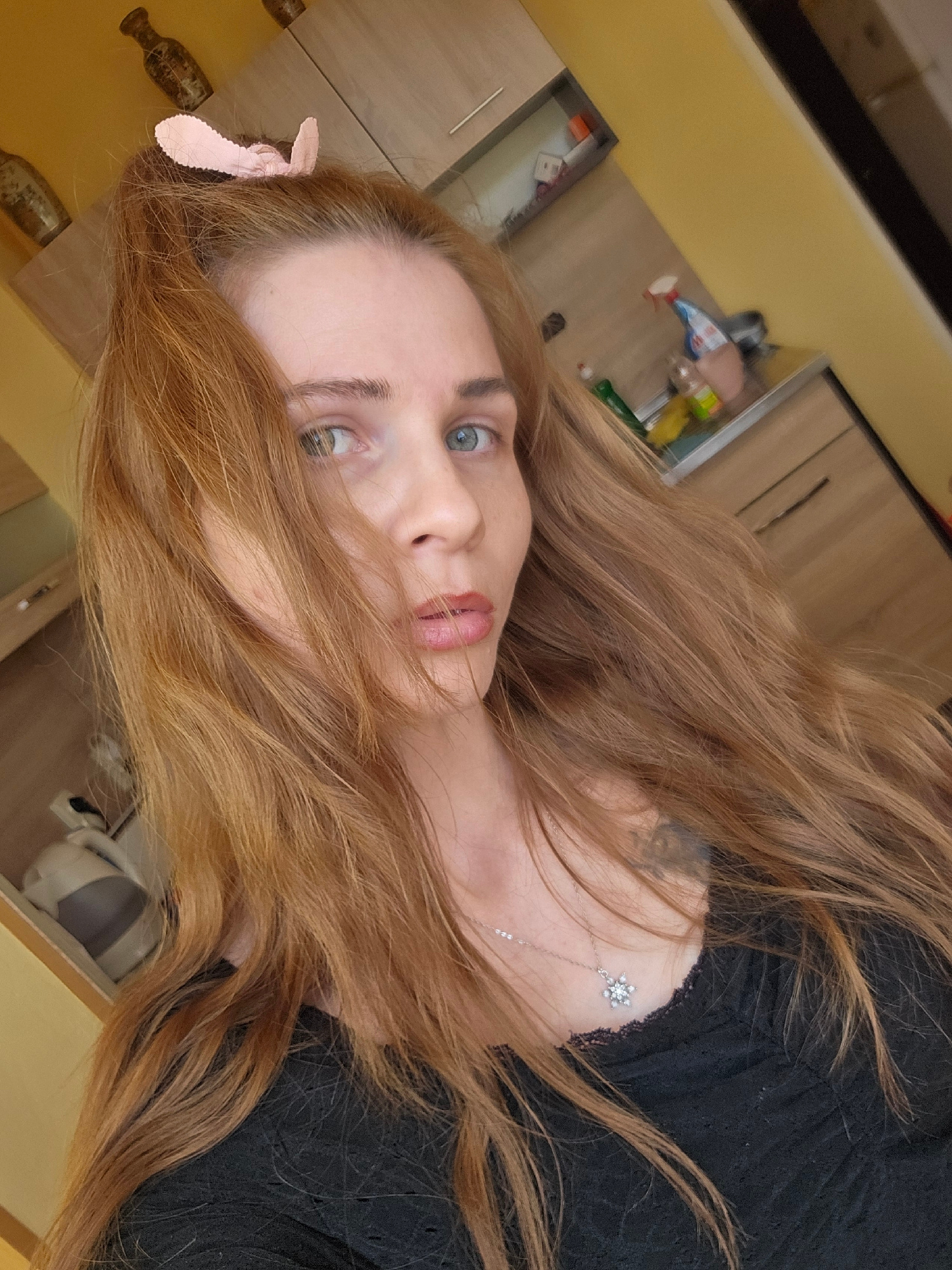 A woman with long, light brown hair is shown in a medium-close, selfie-style shot. She has fair skin, light eyebrows, and blue eyes. She is wearing a black, lace-trimmed top and a silver necklace with…read more