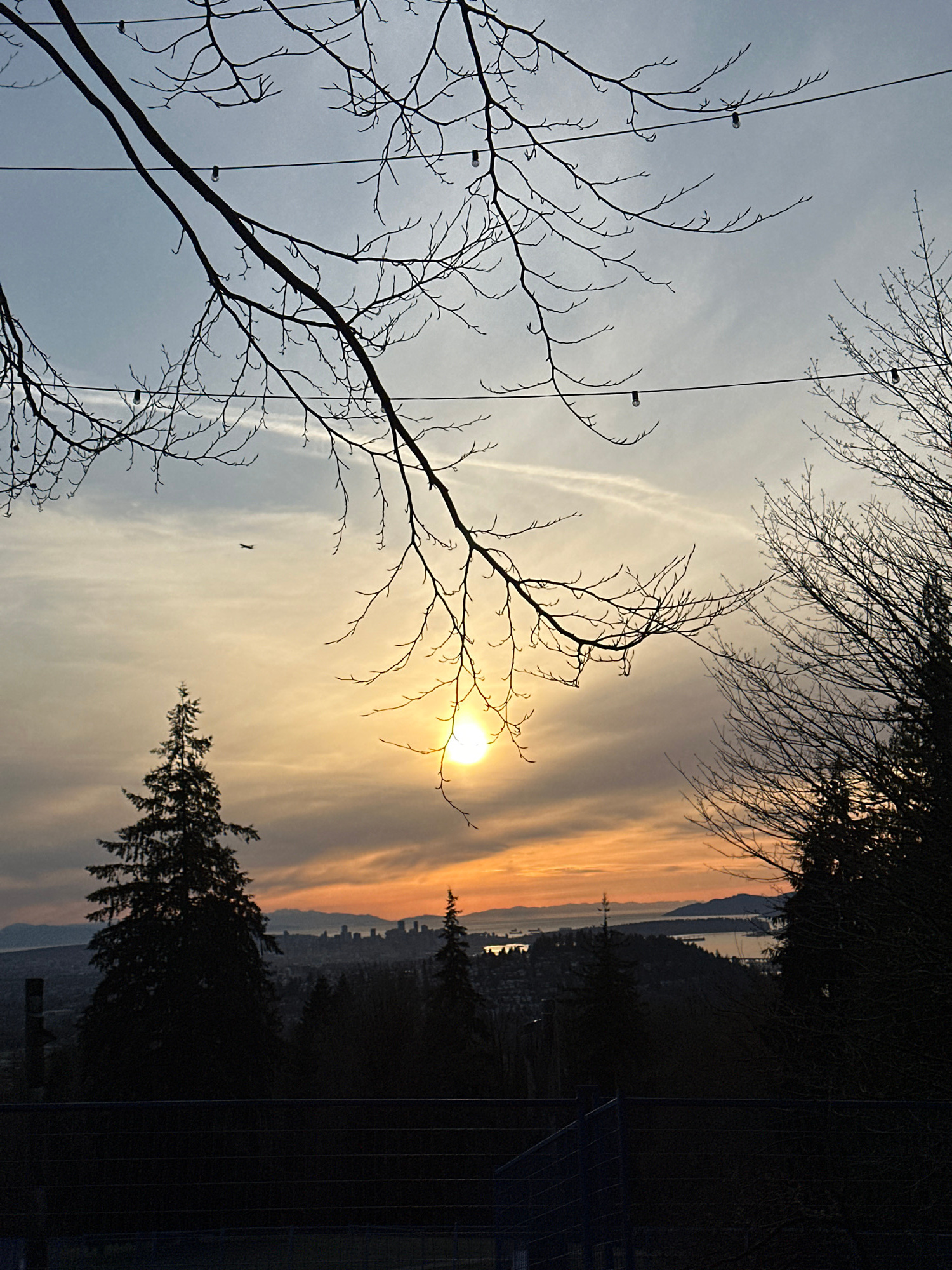 The image shows a sunset landscape, likely in an urban environment, with silhouetted trees framing the scene. The sun is visible through a gap in the tree branches, casting an orange glow on the sky.…read more