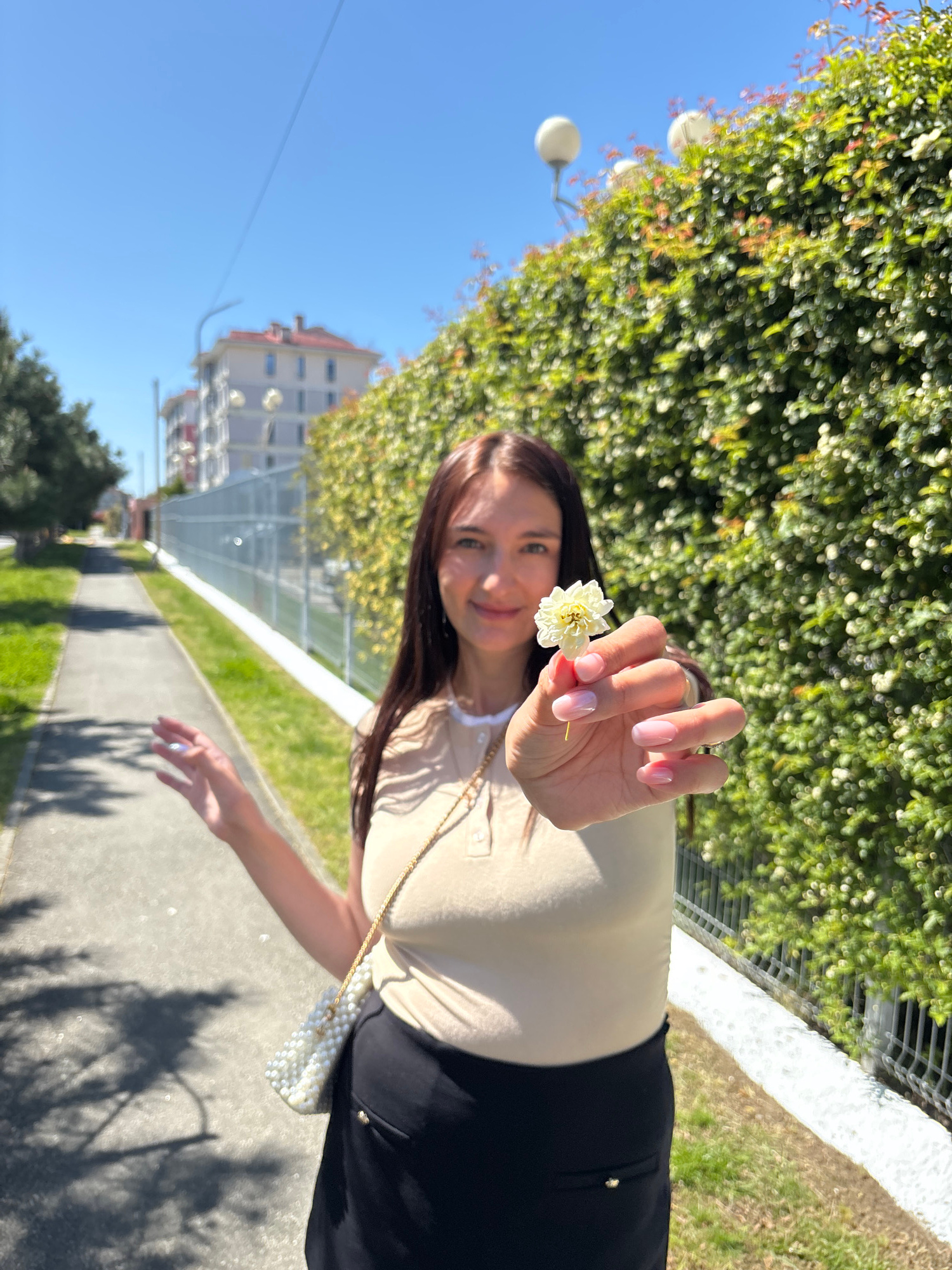 A smiling young woman is featured prominently in this portrait-oriented image, captured outdoors on a bright, sunny day in Sirius, Russia. She has long, dark brown hair and is wearing a beige-colored…read more