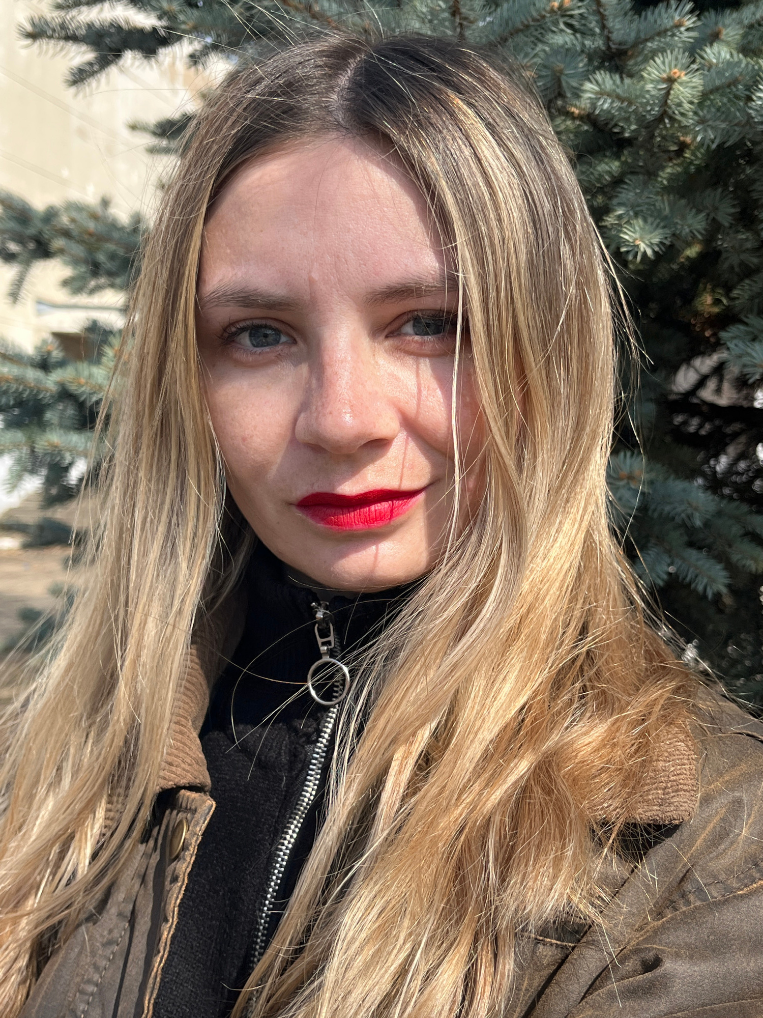 A portrait-style image, rotated 90 degrees counter-clockwise, features a young woman with long, flowing blonde hair that has darker roots. She has blue eyes, fair skin, and is wearing vibrant red lips…read more
