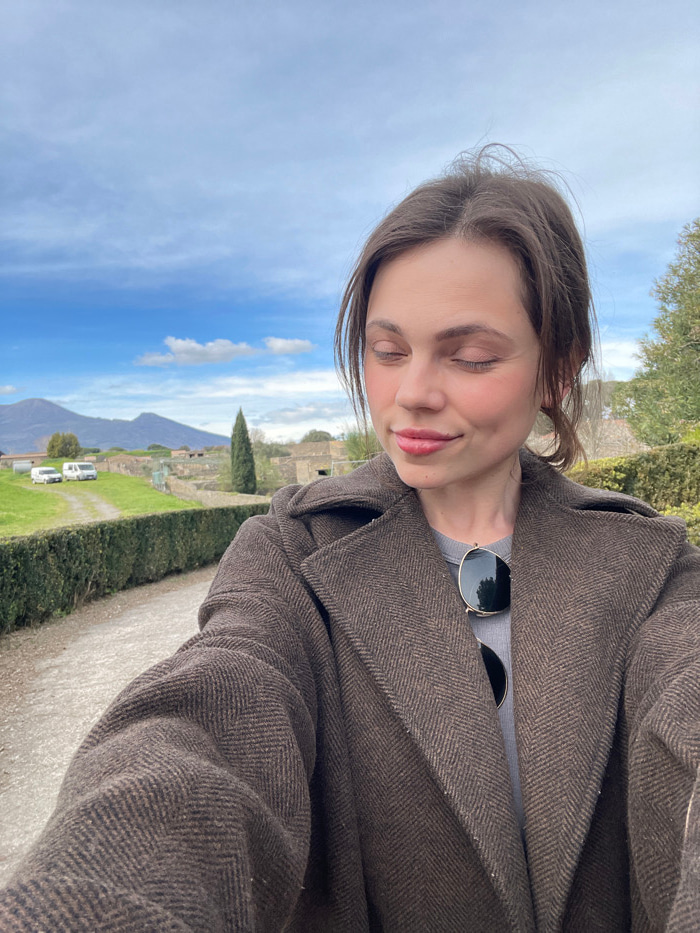 A female subject, positioned in a selfie-style composition, occupies the foreground, her face directed towards the camera with eyes closed and a subtle smile. She has dark hair styled loosely and wear…read more