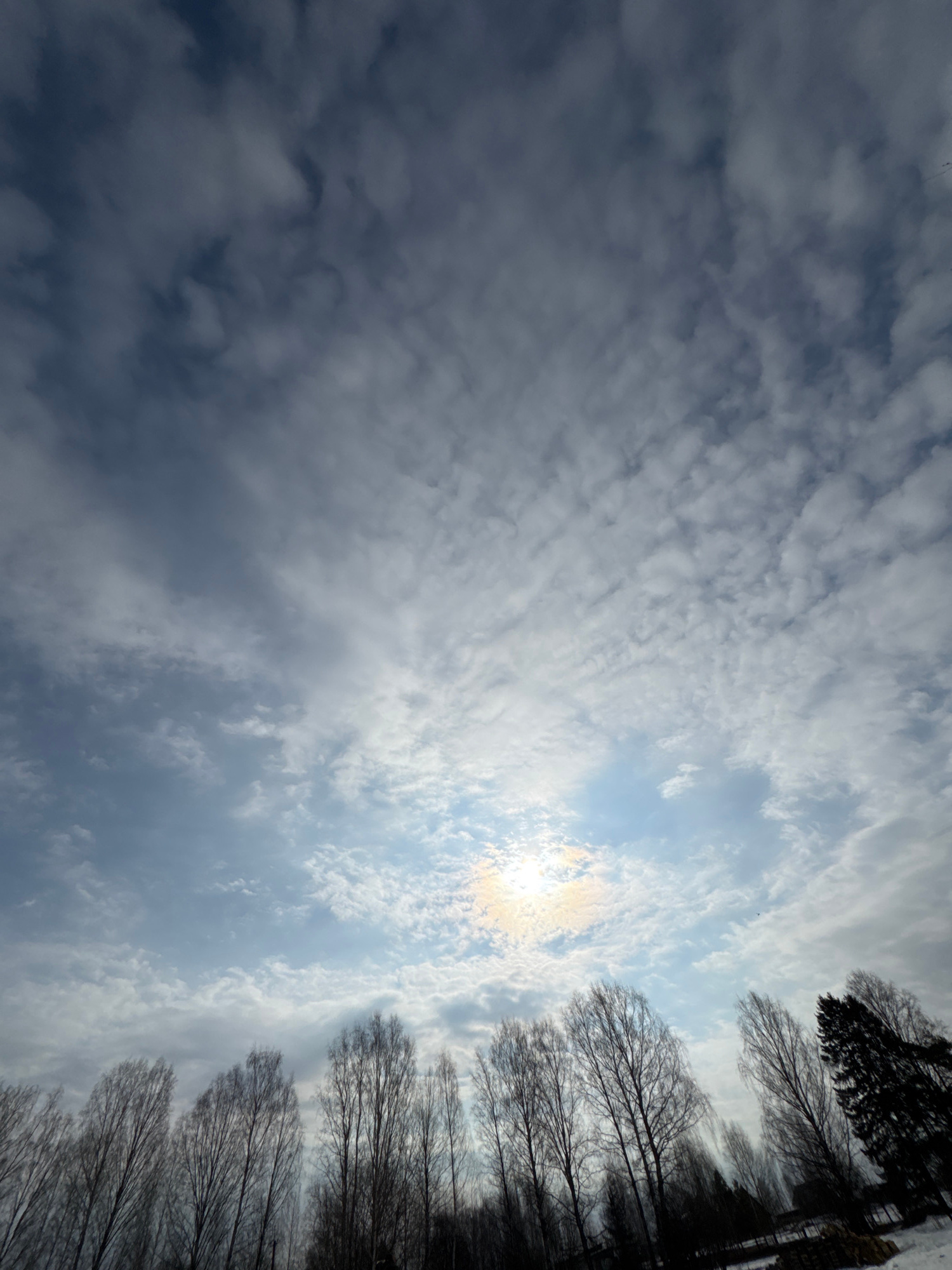 The image shows a view of the sky, predominantly filled with altocumulus clouds, some areas more dense and darker than others. The sun is visible through a thinner patch of clouds. Along the right edg…read more