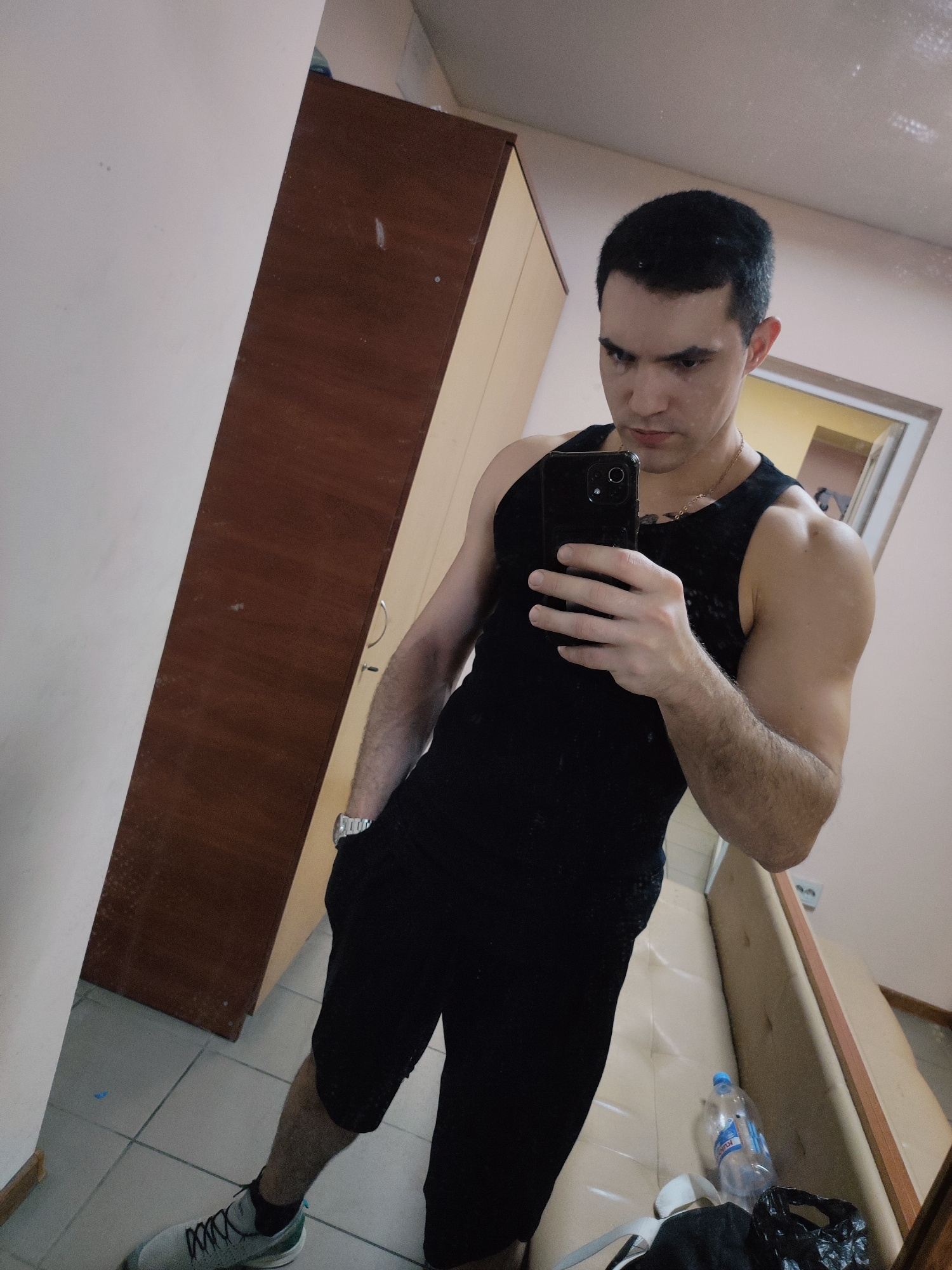 A man is taking a selfie in a room. He is wearing a black tank top and black shorts, and grey sneakers. He is holding a black smartphone in his right hand, partially obscuring his face. He has short,…read more