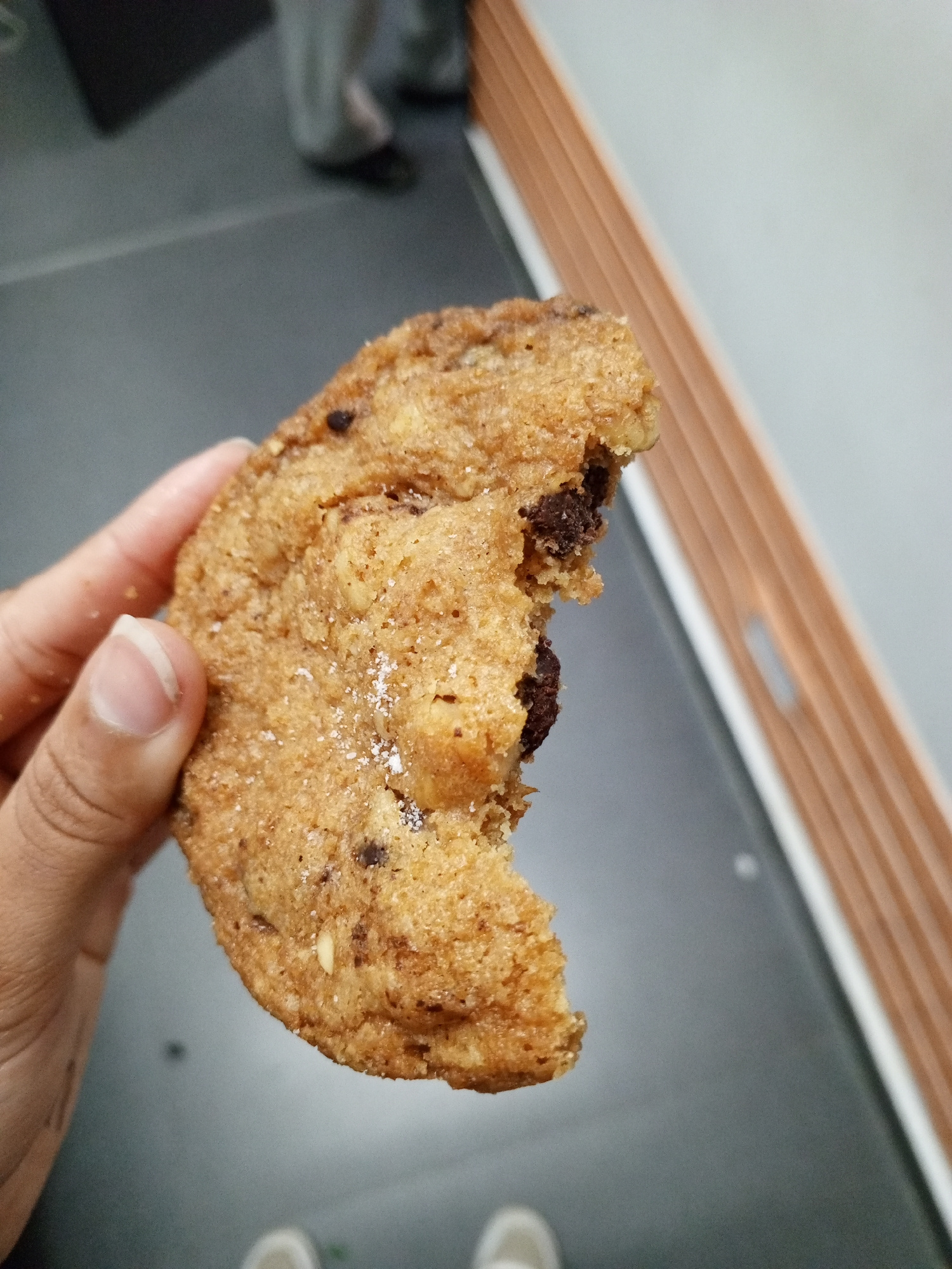 A partially eaten chocolate chip cookie is held in a hand with a gray fingernail. The cookie has a light brown color with dark brown chocolate chips visible. A bite has been taken out of the cookie. I…read more