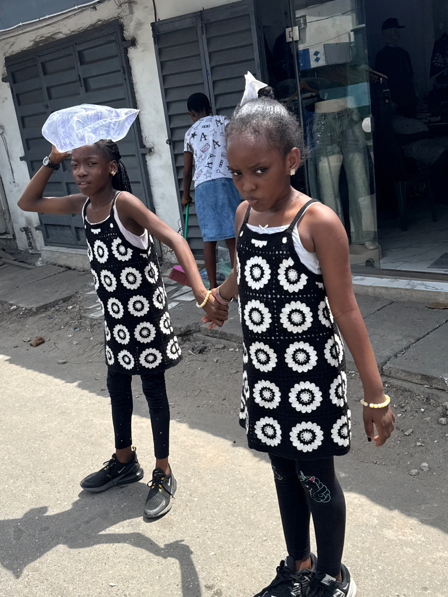 Two young girls, likely sisters, stand side-by-side on a concrete sidewalk in an urban environment, possibly Lagos, Nigeria. The girl on the left holds a translucent plastic bag above her head, whileβ¦read more